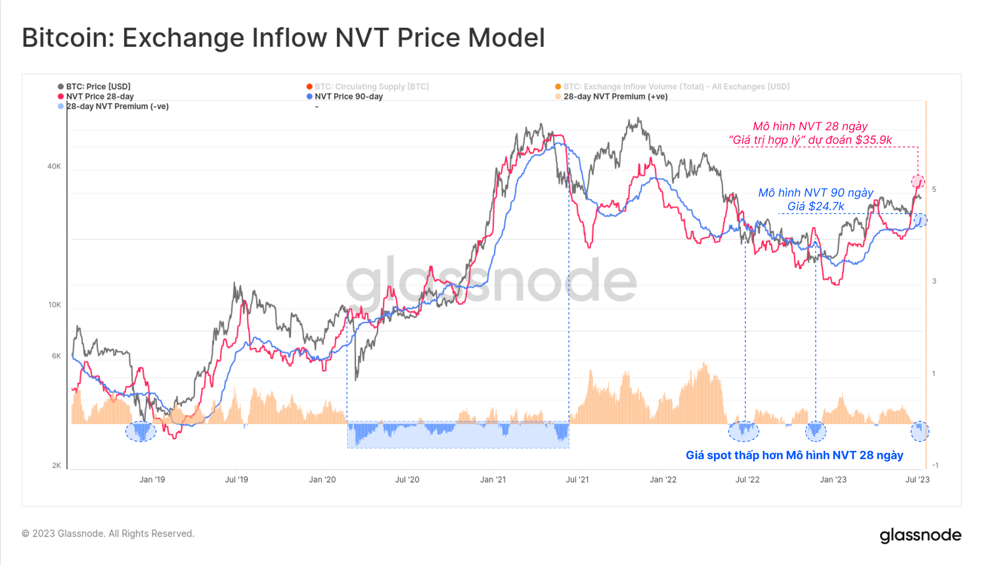 Từ hoạt động liên quan đến sàn giao dịch này, chúng ta có thể phát triển mô hình Giá NVT. Được phát triển ban đầu bởi Willy Woo. Mô hình này tìm cách dự đoán một “giá trị hợp lý” cho một lượng thanh toán khối lượng on-chain nhất định.