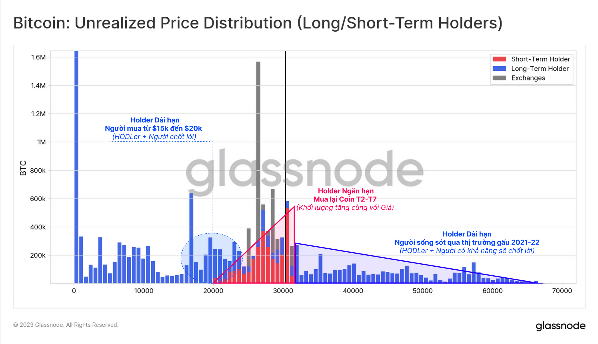 - 🔵 Hầu hết tất cả các BTC có giá mua lại trên $30k đều do LTH nắm giữ. Những nhà đầu tư này là những người sống sót sau thị trường gấu 2021-22. Đây hoặc sẽ là những HODLer cứng rắn trong trận chiến hoặc có khả năng sẽ tạo ra lực cản nếu thị trường tăng giá cao hơn.