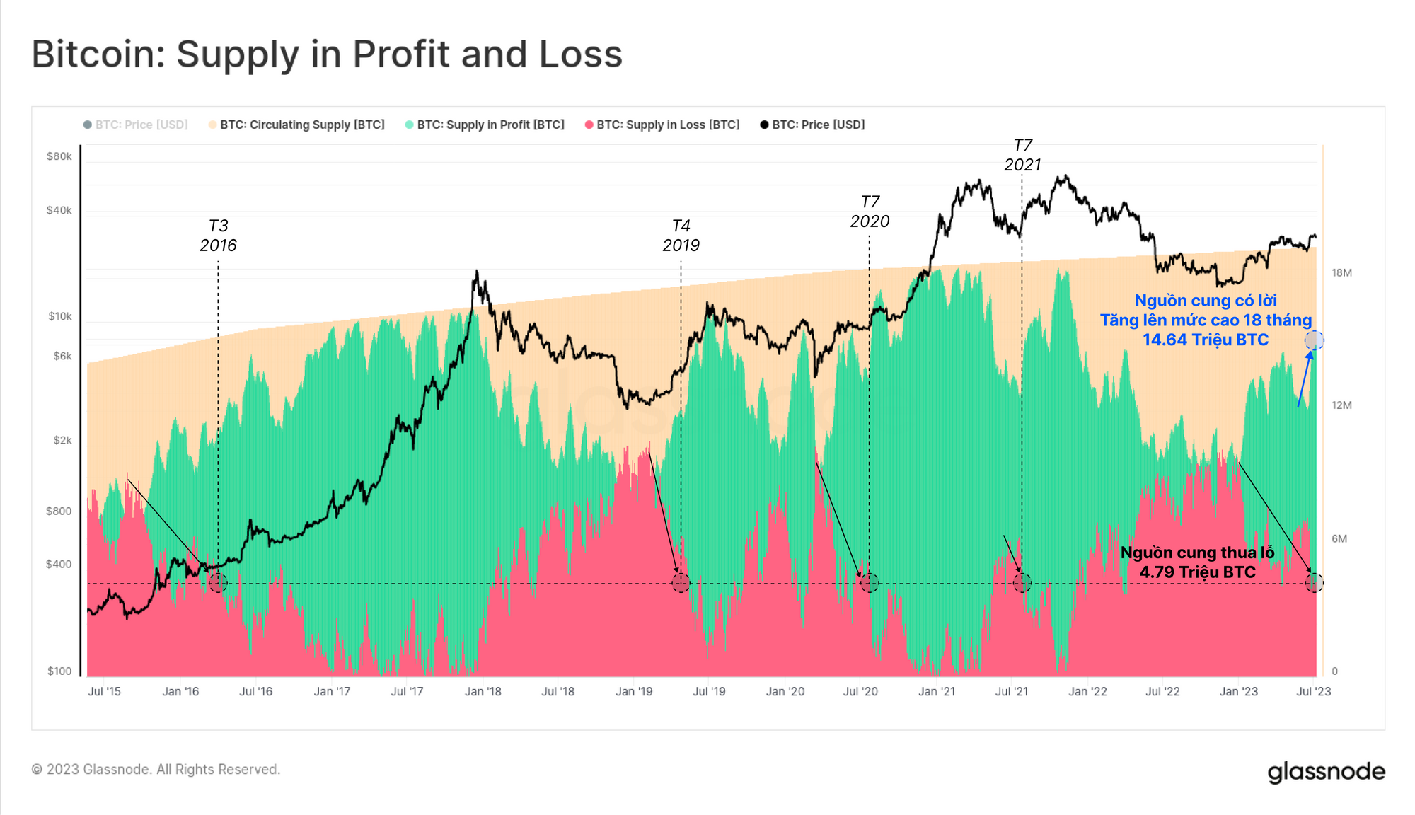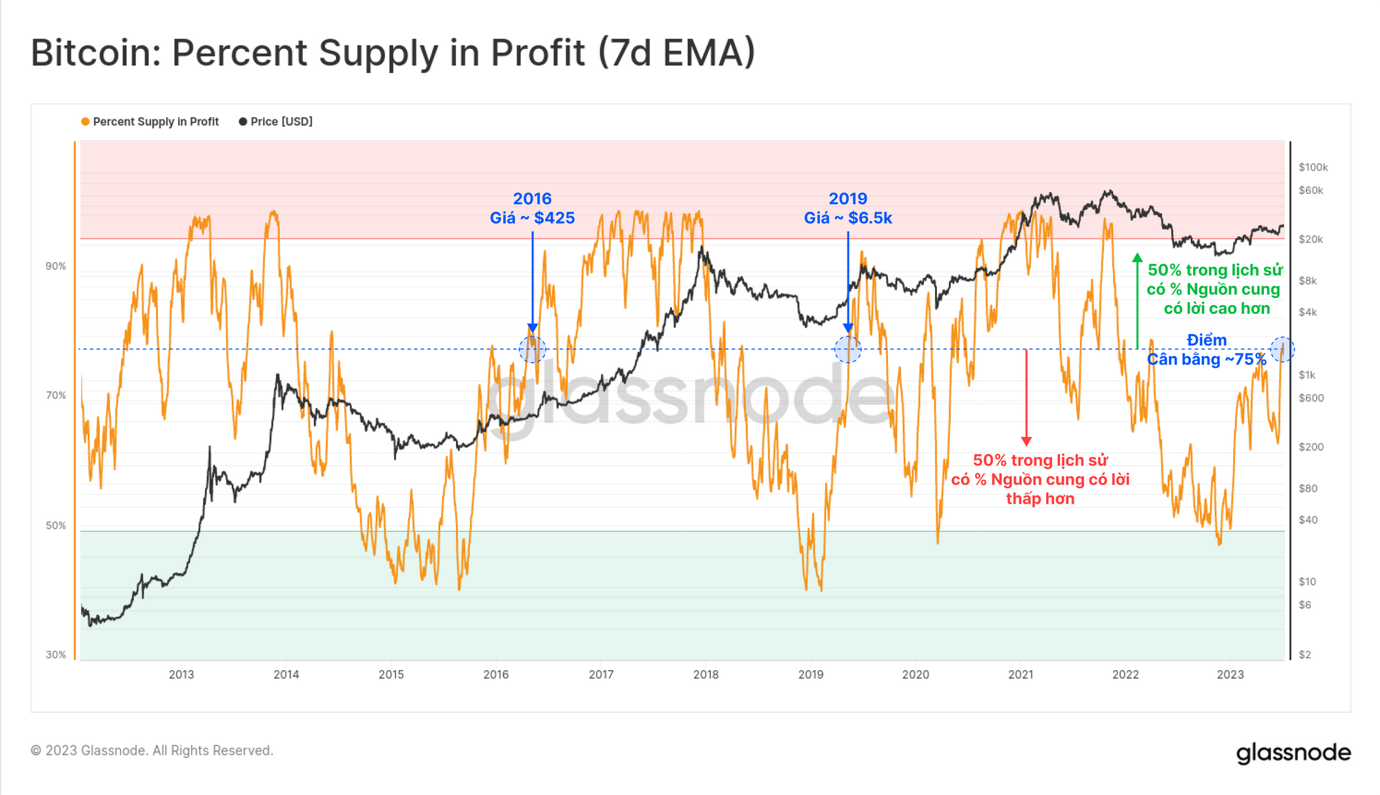 - Tỉ lệ nguồn cung có lãi và lỗ đã đạt đến điểm cân bằng đồng nghĩa với “giai đoạn tái tích lũy” diễn ra trong vài tháng qua đã được thấy trong các chu kỳ trước.