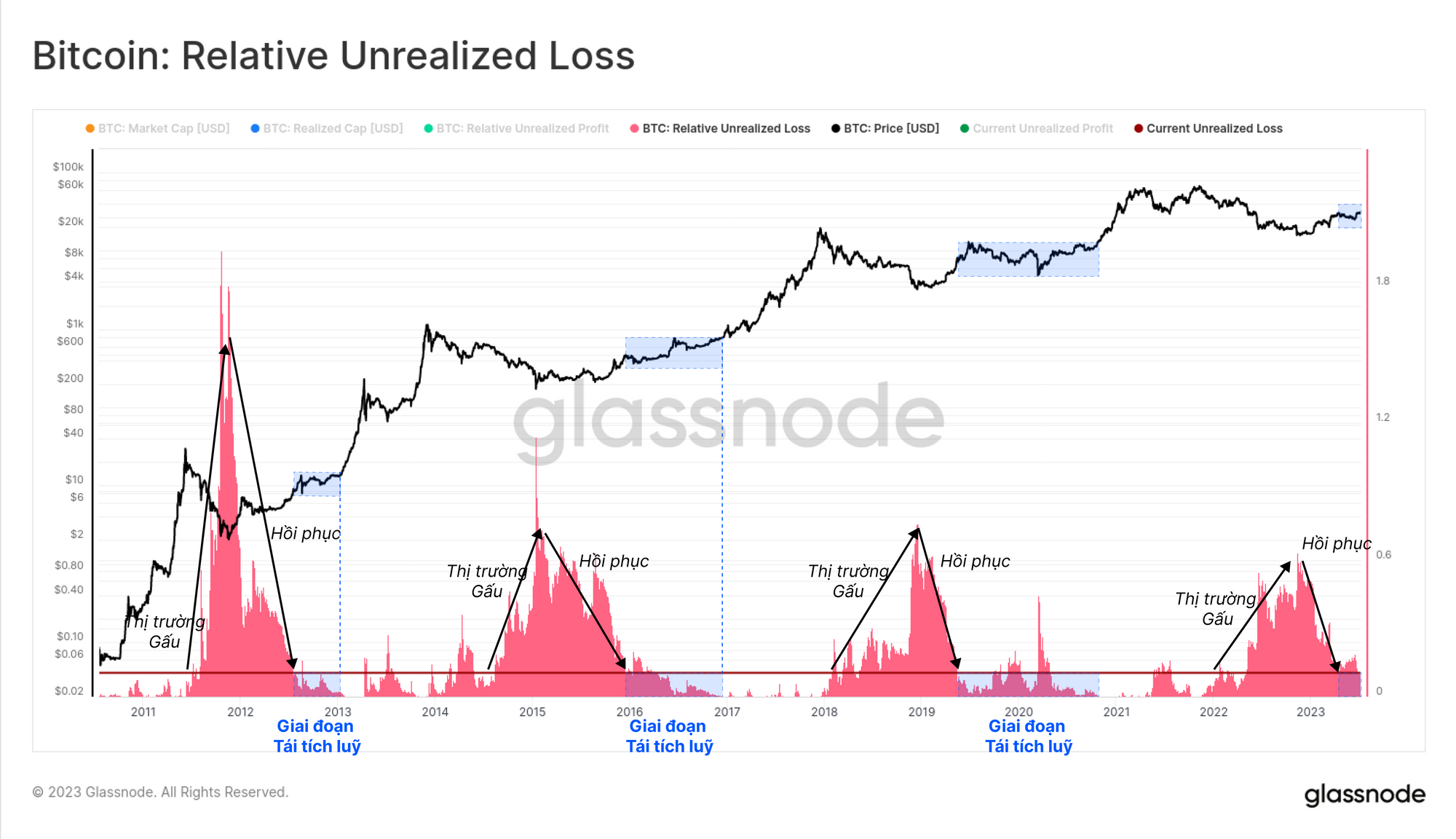 Chúng ta có thể hình dung điều này bằng cách xem tỷ lệ Vốn hóa Thị trường đang trong trạng thái lỗ chưa thực hiện. Trong thị trường gấu, thị trường chìm sâu trong sắc đỏ với các nhà đầu tư dần dần rút lui. Khi thị trường hình thành và sau đó phục hồi từ mức thấp, khả năng sinh lời sẽ phục hồi mạnh mẽ, đạt đến mức tương tự như hiện tại.