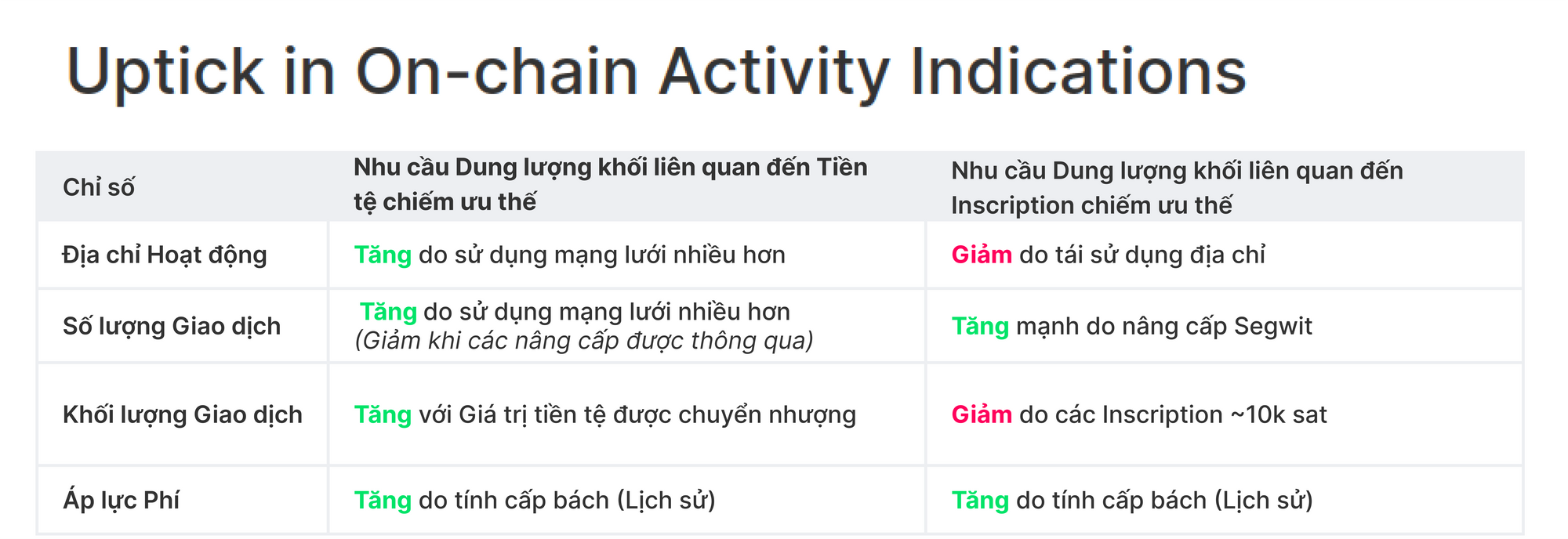Tuy nhiên, do việc tái sử dụng đáng kể các địa chỉ (WoC 20) và khối lượng chuyển nhượng rất nhỏ (~10k sat) liên quan đến inscriptions, các giai đoạn với nguồn cầu cao hiện nay đòi hỏi cách giải thích tinh vi hơn một chút, được tóm tắt trong bảng sau.