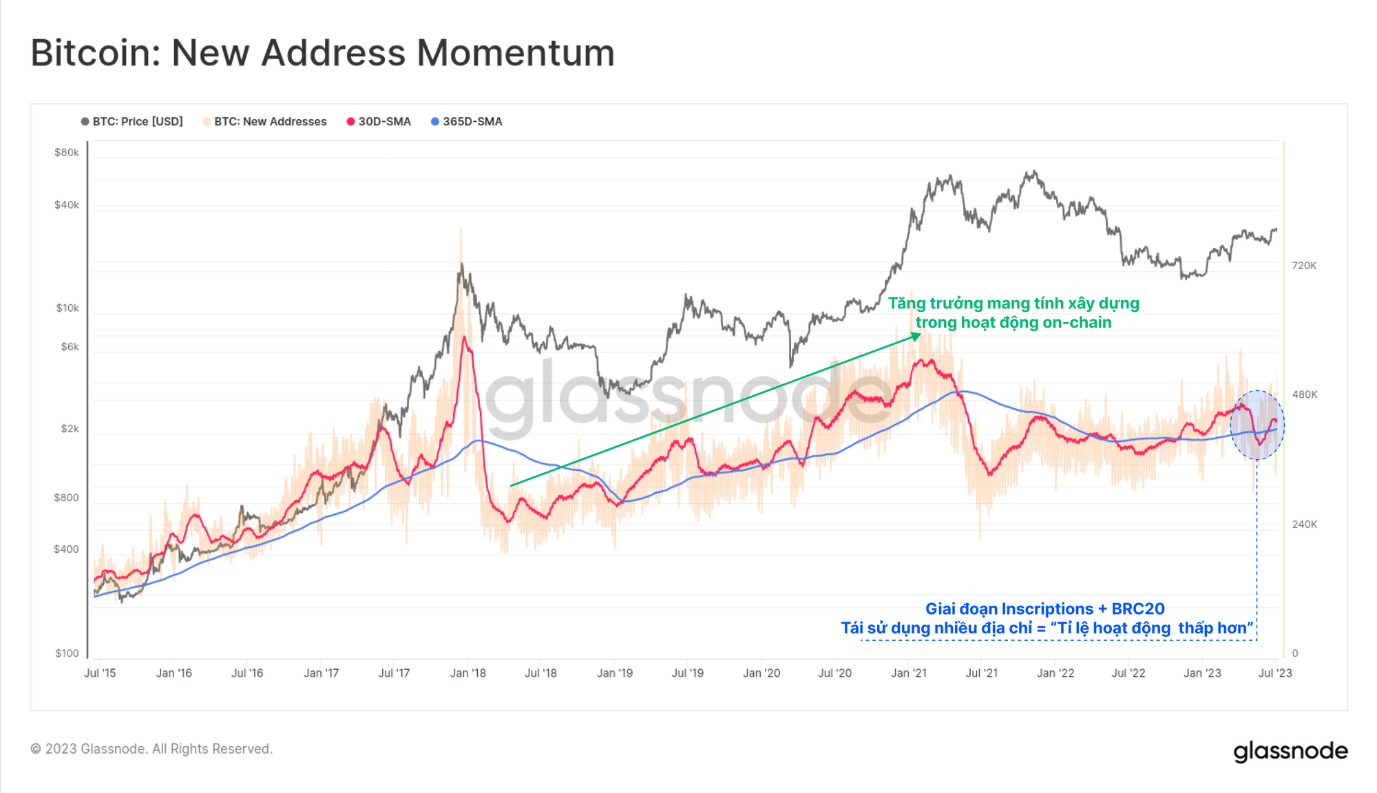 Với luận điểm này, chúng ta có thể thấy rằng khi inscriptions giảm đi, động lượng địa chỉ hoạt động đã bắt đầu tăng trở lại. Cách giải thích truyền thống sẽ xem 2-3 tháng qua là sự suy giảm ngụ ý trong hoạt động của mạng Bitcoin. Tuy nhiên, cách giải thích chính xác là nó chỉ đơn giản là một sản phẩm của việc tái sử dụng đáng kể các địa chỉ được thực hiện bởi các nhà giao dịch inscriptions và hoạt động mạng đang thực sự bùng nổ, với các block chứađầy giao dịch.