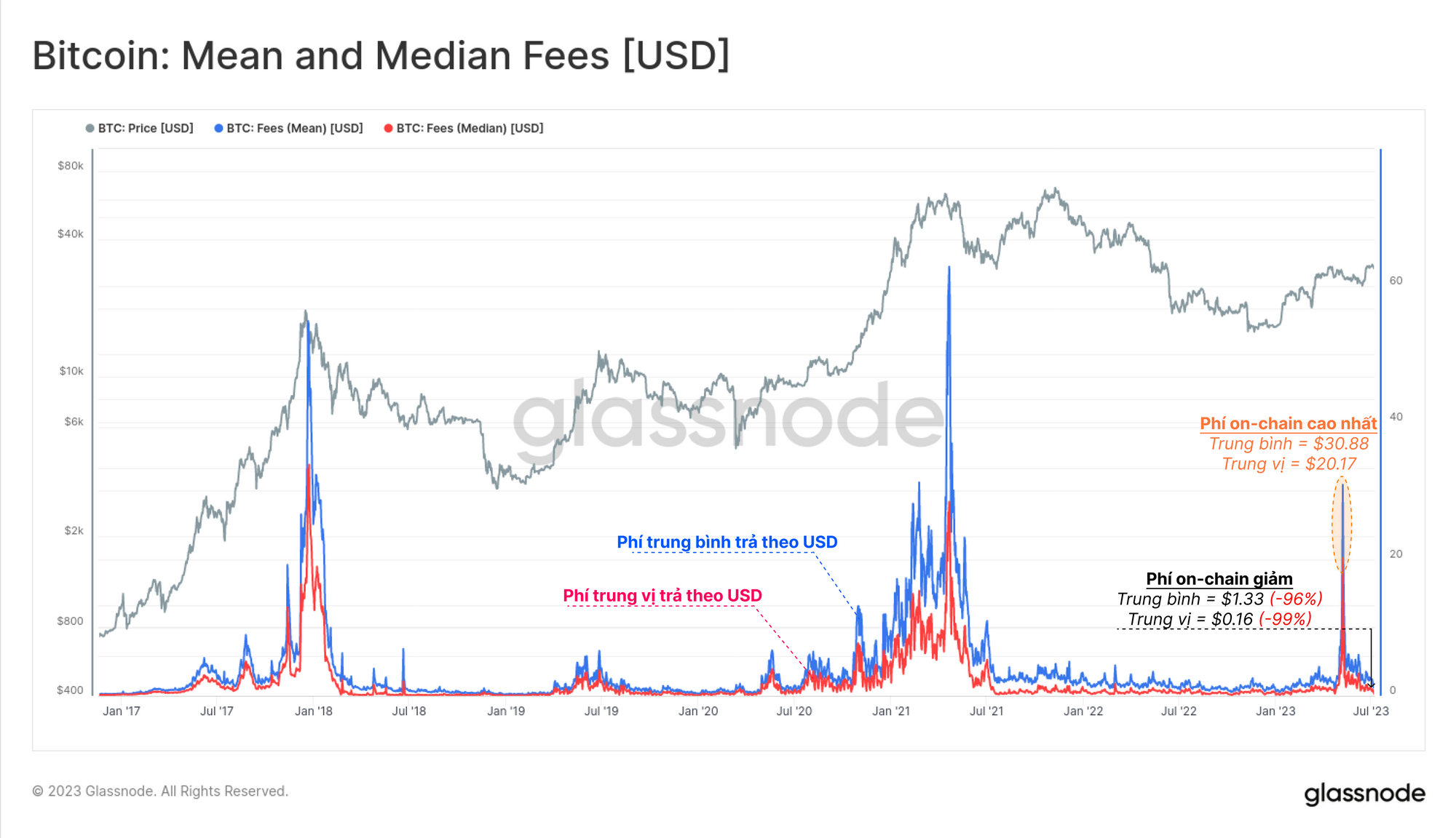 Sau vài tháng tắc nghẽn mạng, các mempool dần trở nên thông thoáng hơn và phí giao dịch on-chain đang giảm dần. Phí giao dịch bằng USD trên Bitcoin đã giảm hơn 96% kể từ đỉnh điểm của cơn sốt BRC-20 vào tháng 5, với mức phí trung bình hiện được trả là $1.33 và mức phí trung vị giảm xuống còn $0.16.