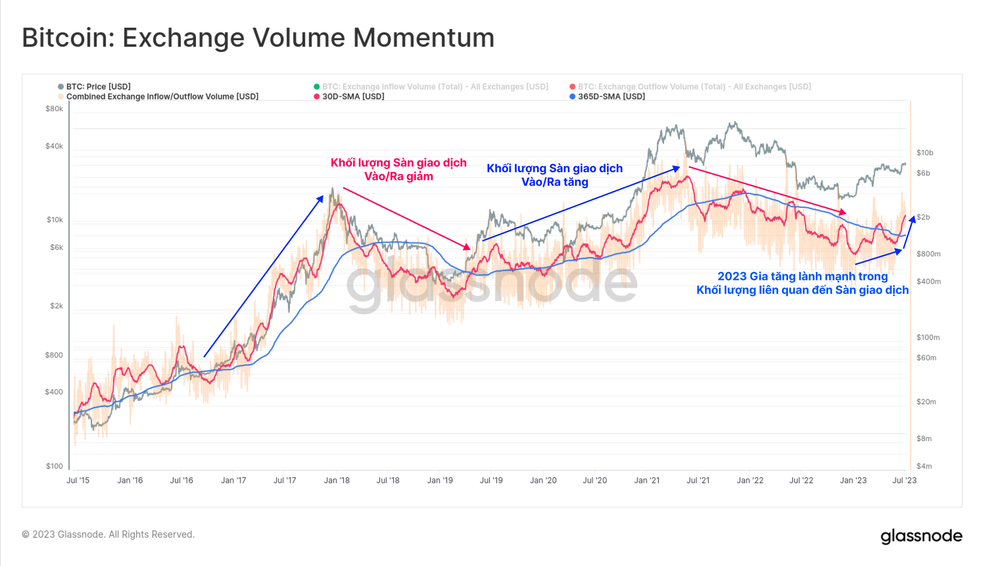 Nếu chỉ tách riêng dòng tiền vào và ra của sàn giao dịch chúng ta sẽ thấy rằng mạng lưới Bitcoin đang bước vào giai đoạn động lượng tích cực. Mức trung bình hàng tháng của dòng tiền sàn giao dịch hiện cao hơn hàng năm, một dấu hiệu lịch sử cho thấy việc áp dụng ngày càng tăng từ quan điểm tài sản tiền tệ.