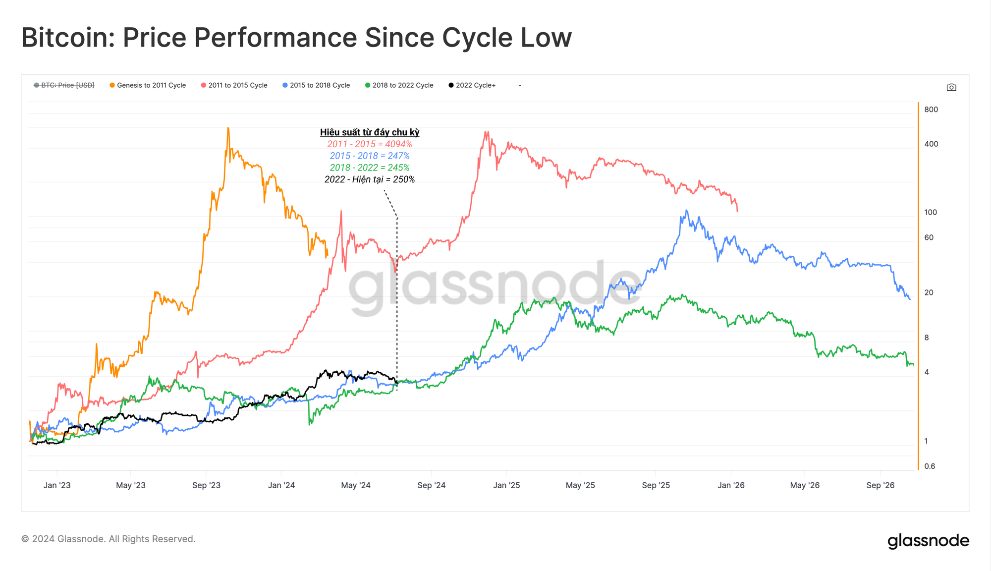 Nếu đánh giá hiệu suất giá so với đáy của từng chu kỳ, thì thị trường 2023-24 có hành vi tương tự một cách kỳ lạ với hai chu kỳ gần đây nhất (2018-21 và 2015-17). Lý do Bitcoin đi theo con đường tương tự như vậy là một chủ đề tranh luận thường xuyên, nhưng nó tiếp tục cung cấp một khung tham chiếu có giá trị để các nhà phân tích suy nghĩ về cấu trúc và thời gian chu kỳ.