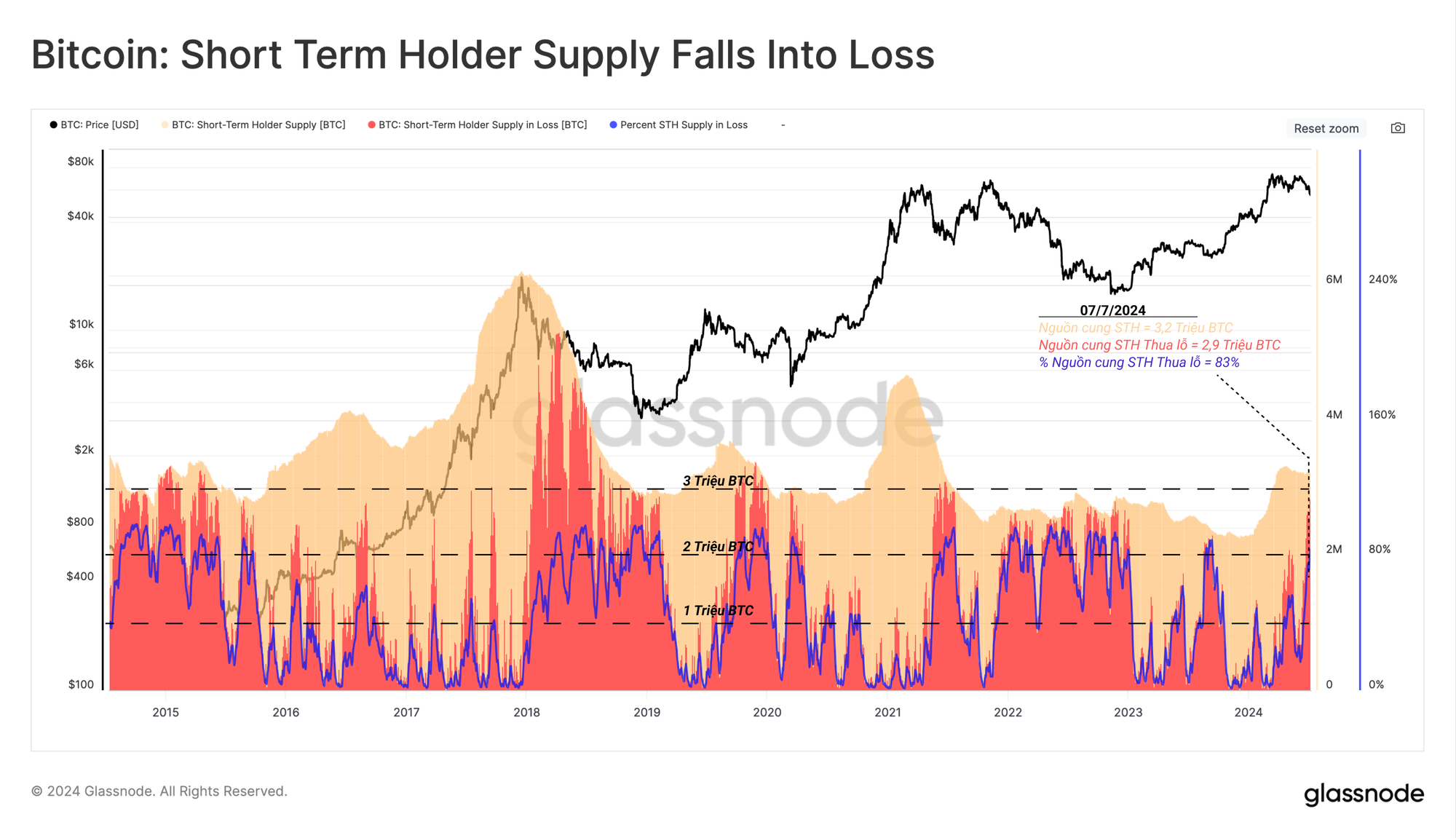 Trong các thị trường tăng trưởng bền vững, các đáy cục bộ thường được thiết lập sau khi khối lượng nguồn cung Người nắm giữ ngắn hạn bị thua lỗ đạt trạng thái bão hòa khoảng 1-2 triệu BTC. Trong những trường hợp nghiêm trọng hơn, nguồn cung thua lỗ này có thể đạt 2-3 triệu BTC.
