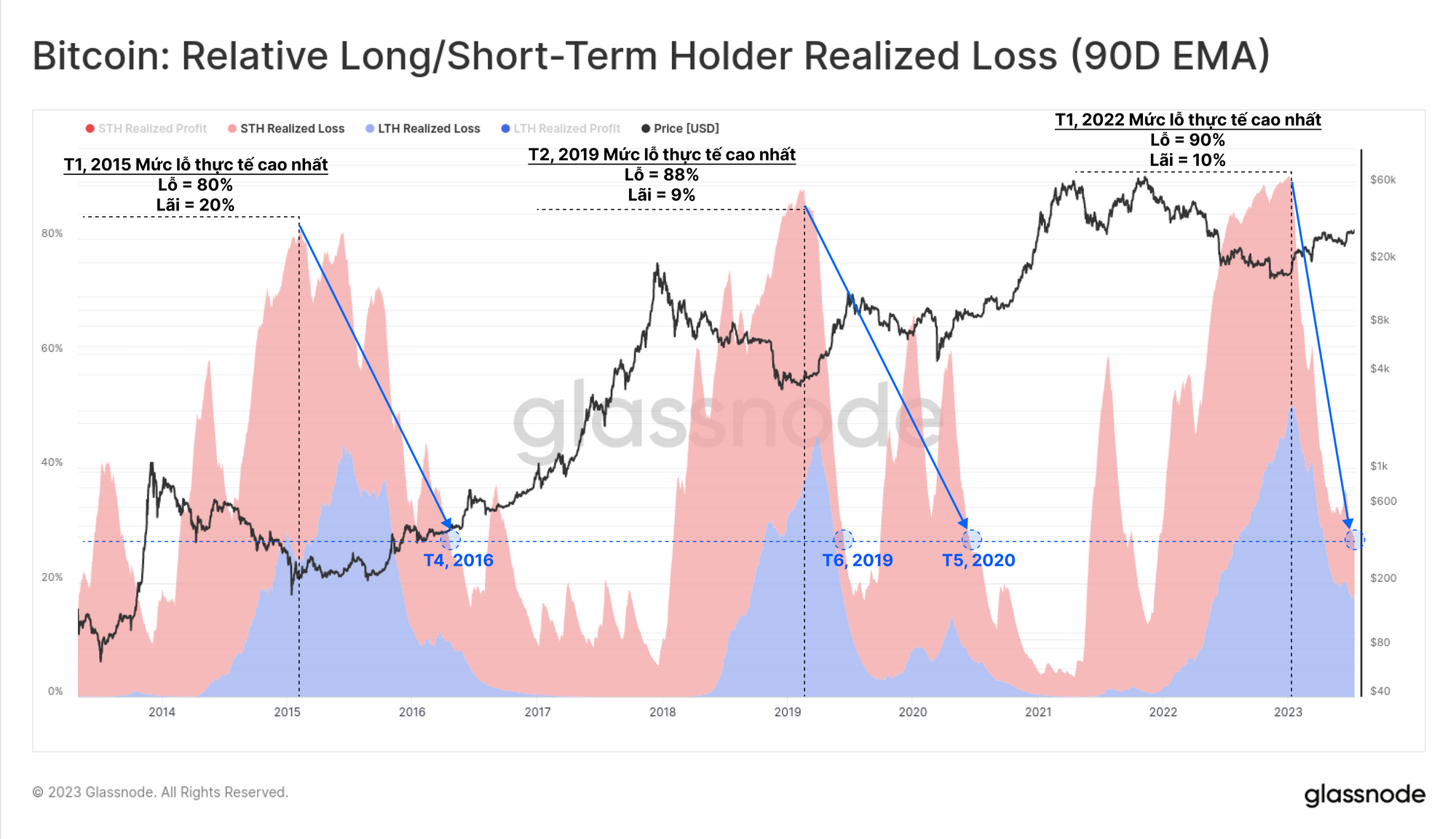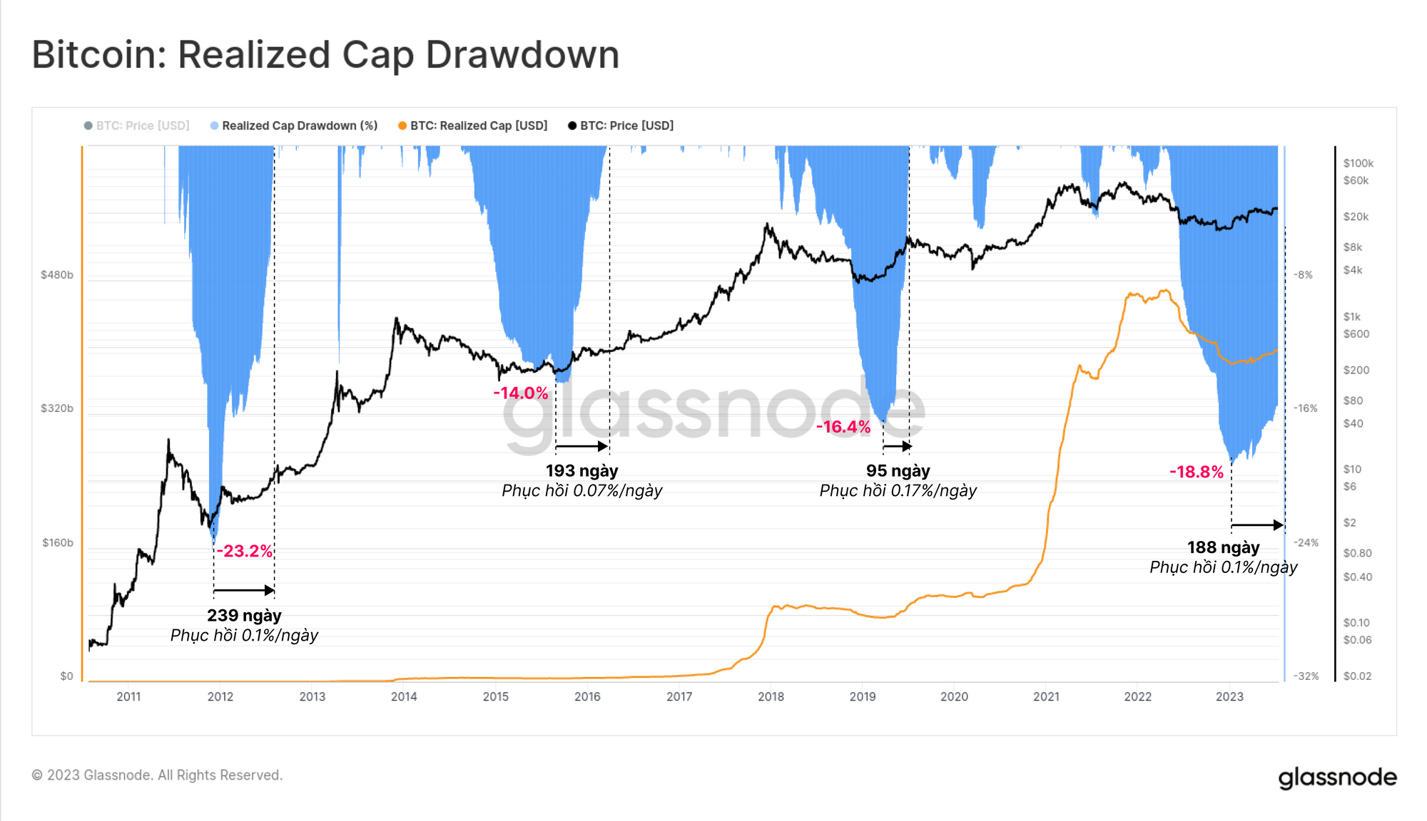 Trong các thị trường gấu, Bitcoin thường chứng kiến dòng vốn chảy ra đáng kể khi các nhà đầu tư chốt lỗ. Mức sụt giảm vốn hoá thực tế năm 2022 đứng thứ hai với mức giảm là -18.8%, cho thấy mức độ nghiêm trọng của thị trường gấu. Việc phục hồi về ATH của vốn hoá thực tế trong các chu kỳ trước đã mất từ 95 đến 239 ngày. Cho đến nay sự phục hồi đã diễn ra với tốc độ tương tự.