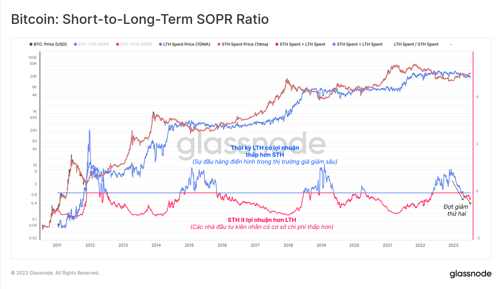 Việc nhóm LTH chi tiêu các đồng coin có cơ sở chi phí trung bình cao hơn (bội số lợi nhuận thấp hơn) so với nhóm STH là điều không bình thường. Tuy nhiên, những sự kiện như vậy có xảy ra và trong lịch sử nó gắn liền với các sự kiện đầu hàng trong thị trường giá giảm sâu. Đây là những giai đoạn mà ngay cả những người mạnh nhất cũng bị loại khỏi thị trường, đặc biệt là những người đã mua gần đỉnh chu kỳ và sau đó vượt qua toàn bộ thời gian của xu hướng giảm.