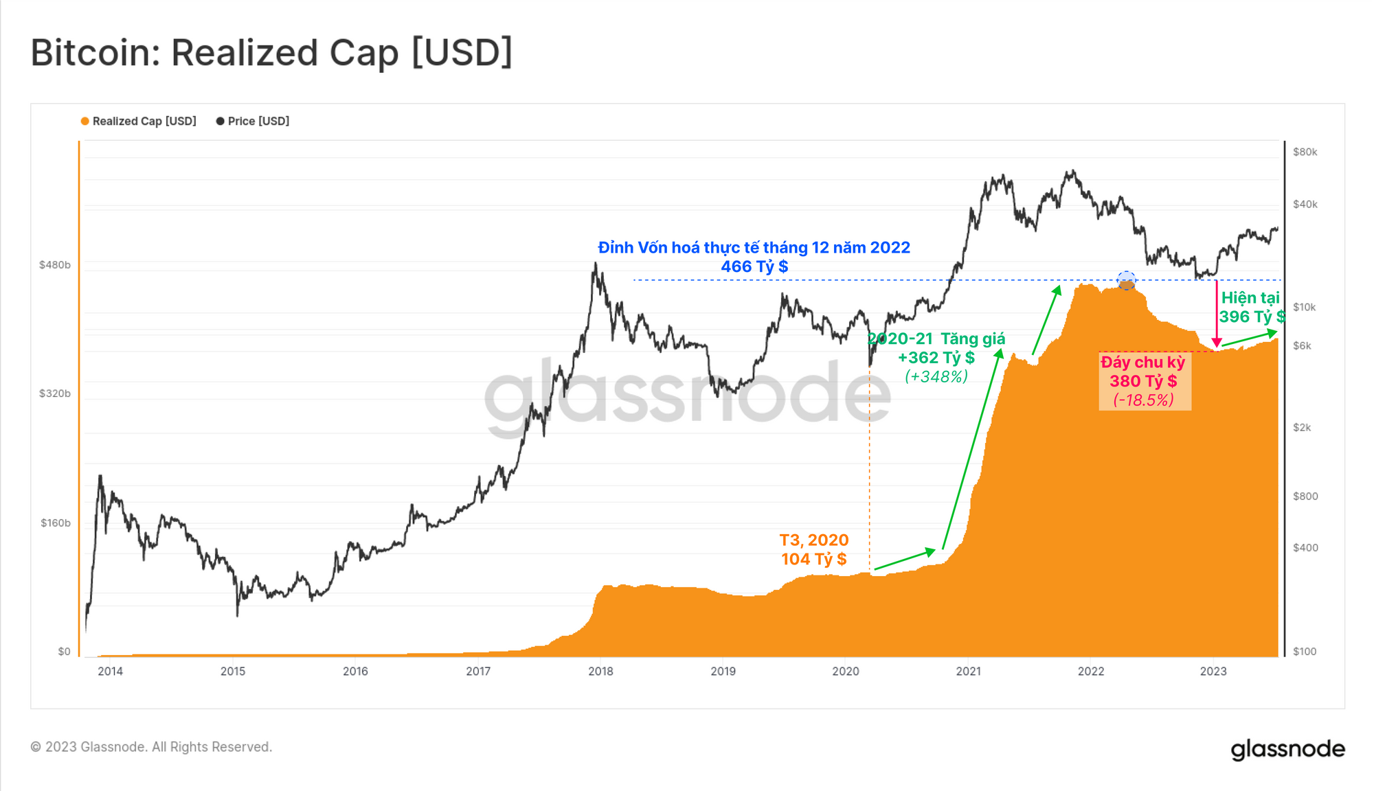 Vốn hóa thực tế hiện chỉ ở mức 400 tỷ đô la và cho thấy rằng một dòng vốn ổn định đang đổ vào trong suốt năm 2023. Bởi vì số liệu này tăng lên, nó báo hiệu rằng các đồng coin đang đổi chủ với mức giá cao hơn, gợi ý một mức tăng khiêm tốn trong nguồn cầu mới trong năm nay.