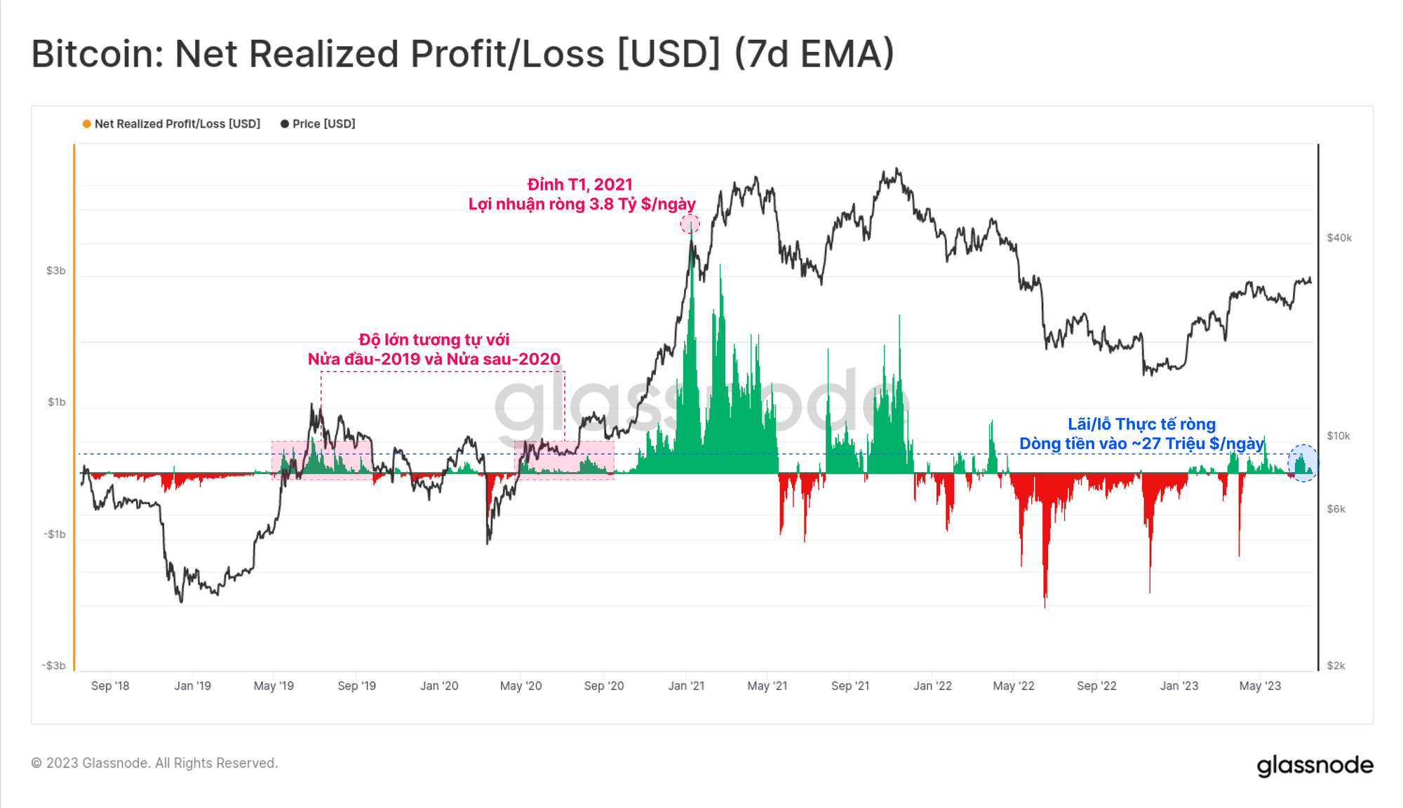Tuy nhiên, nếu chúng ta xem xét điều này từ lăng kính tổng giá trị thực tế tính theo USD (lãi cộng lỗ) thì nó vẫn ở gần mức thấp nhất trong chu kỳ với chỉ 290 triệu đô la/ngày. Mặc dù đây là một khoản tiền đáng kể trên cơ sở danh nghĩa, nhưng nó một lần nữa có thể so sánh với mức đỉnh năm 2019 và đến tháng 10 năm 2020 khi giá BTC thấp hơn 50% so với hiện tại.