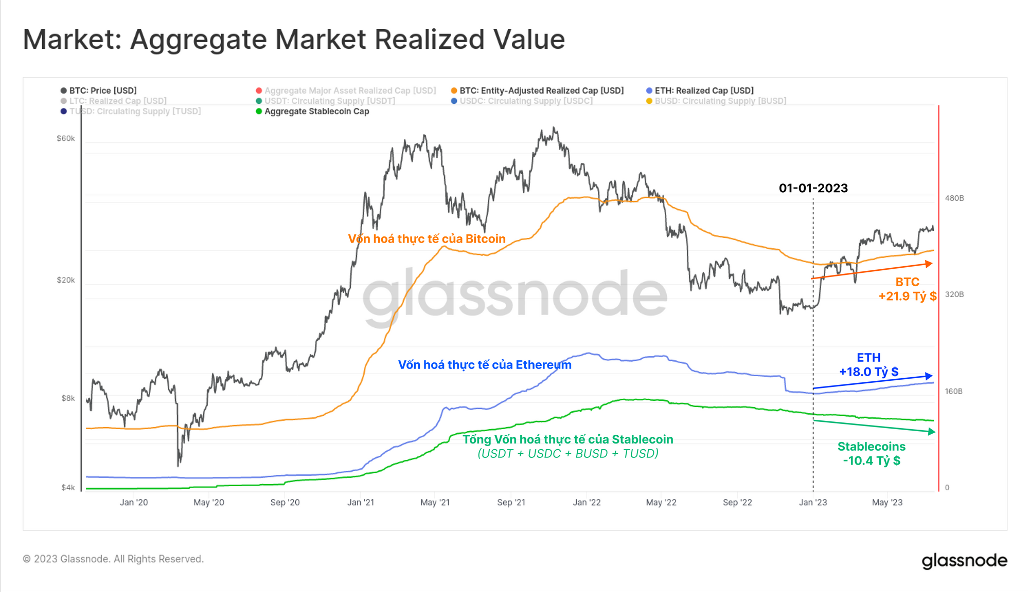 Chúng tôi cũng có thể đánh giá sự thay đổi trên thị trường tài sản kỹ thuật số rộng hơn bằng cách so sánh Vốn hoá thực tế của Bitcoin và Ethereum với nguồn cung của các loại tiền ổn định hàng đầu. Bằng biện pháp này, chúng ta có thể thấy rằng hầu hết các dòng vốn đều đến thông qua hai tài sản chính là BTC và ETH, cả hai đều có dòng vốn vào theo thứ tự lần lượt là +21.9 tỷ đô la và +18 tỷ đô là từ đầu năm đến nay.