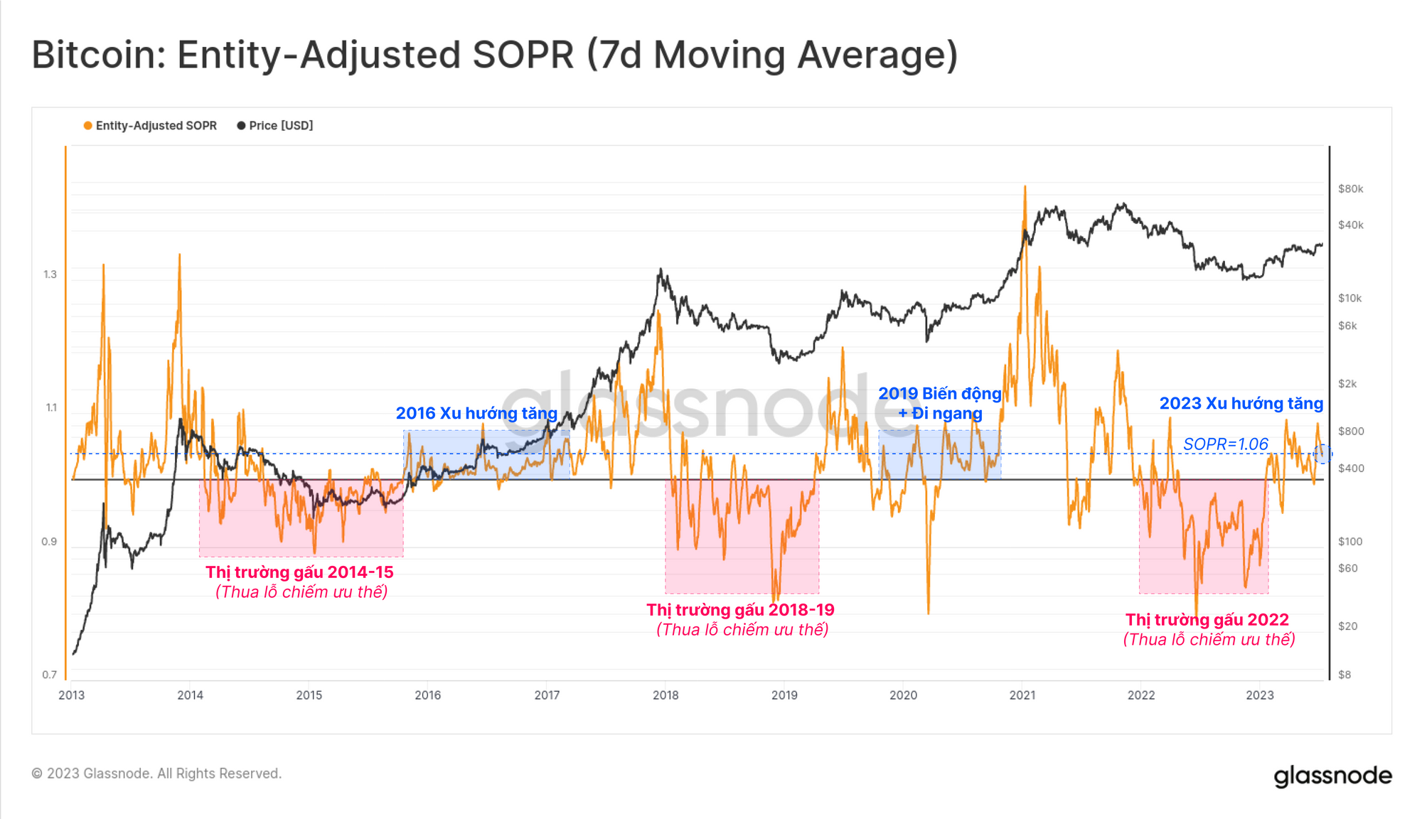 SOPR hiện nằm trong chế độ lợi nhuận chi phối, ghi nhận giá trị là 1.06, cho thấy việc đổi chủ các đồng coin trung bình đang có lợi nhuận 6%. Điều này một lần nữa có đặc điểm tương tự như giai đoạn 2016 và 2019.
