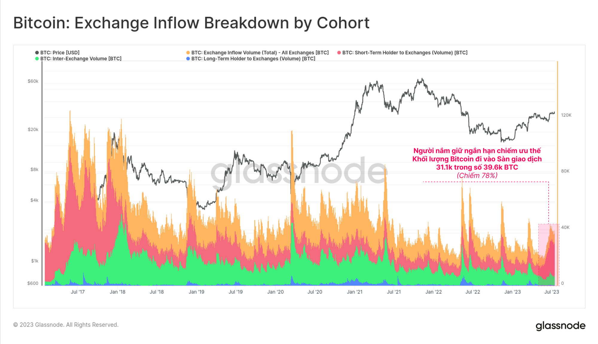 Từ đó, việc phân tích khối lượng dòng vốn vào sàn giao dịch cho thấy rằng Người nắm giữ ngắn hạn (STH) là những thực thể chính đang hoạt động trên thị trường. Trong tổng số 39.6k BTC đi vào sàn giao dịch hàng ngày, 78% trong số này được liên kết với nhóm STH, là những nhà đầu tư đã hoạt động kể từ đầu tháng 2.
