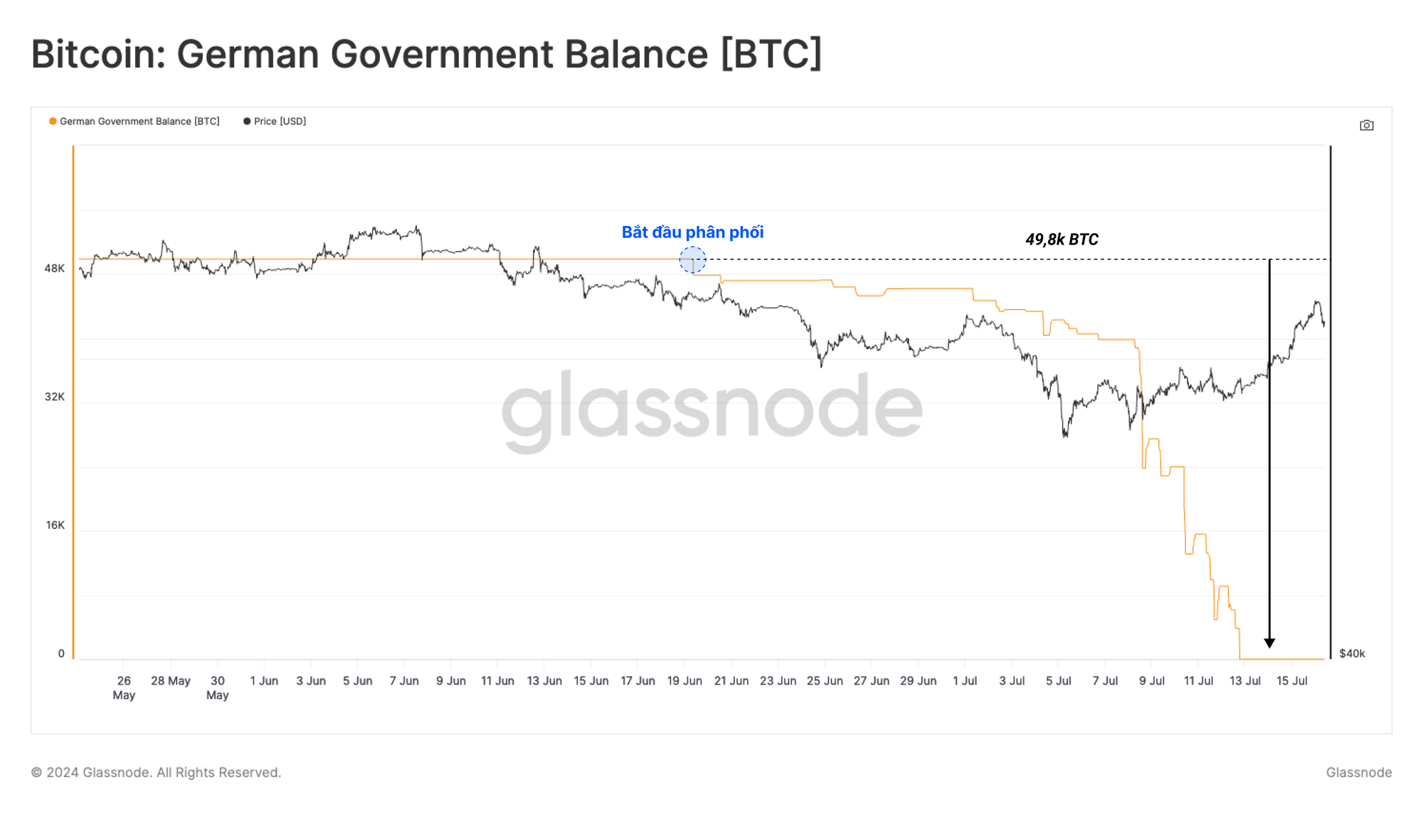 Quan sát áp lực bán của Chính phủ Đức, chúng tôi có thể thấy số dư 48,8k BTC của họ đã cạn kiệt chỉ sau vài tuần. Phần lớn được phân phối trong khoảng thời gian rất ngắn từ ngày 7 tháng 7 đến ngày 10 tháng 7 với hơn 39,8k BTC đã chảy ra khỏi các ví được dán nhãn.