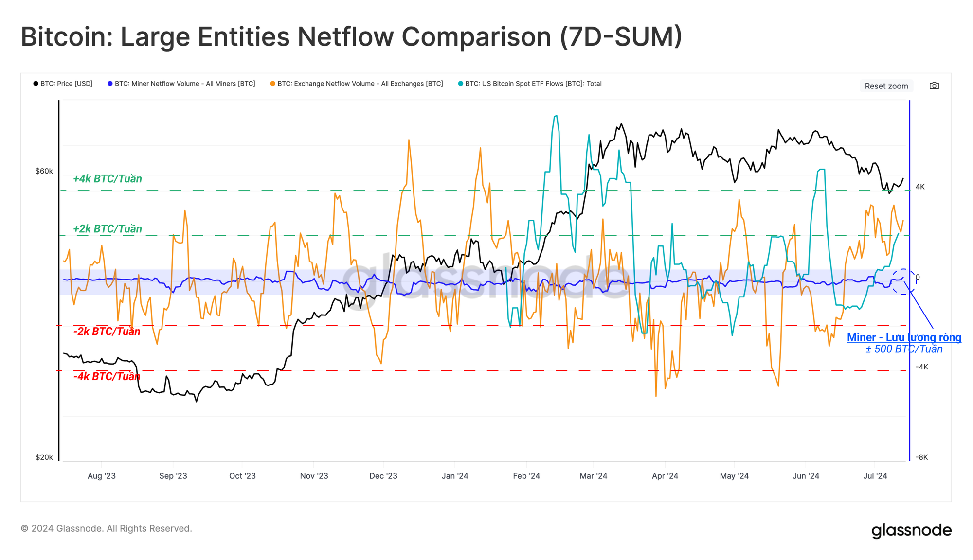 Biểu đồ bên dưới thể hiện hoạt động dòng tiền ra ròng tích lũy của các thực thể quy mô lớn này kể từ ATH 73k USD. Từ đó, có thể thấy áp lực bên bán từ miner tương đối nhỏ so với Chính phủ, dòng vốn ETF chảy ra và khối lượng tiền gửi sàn giao dịch.