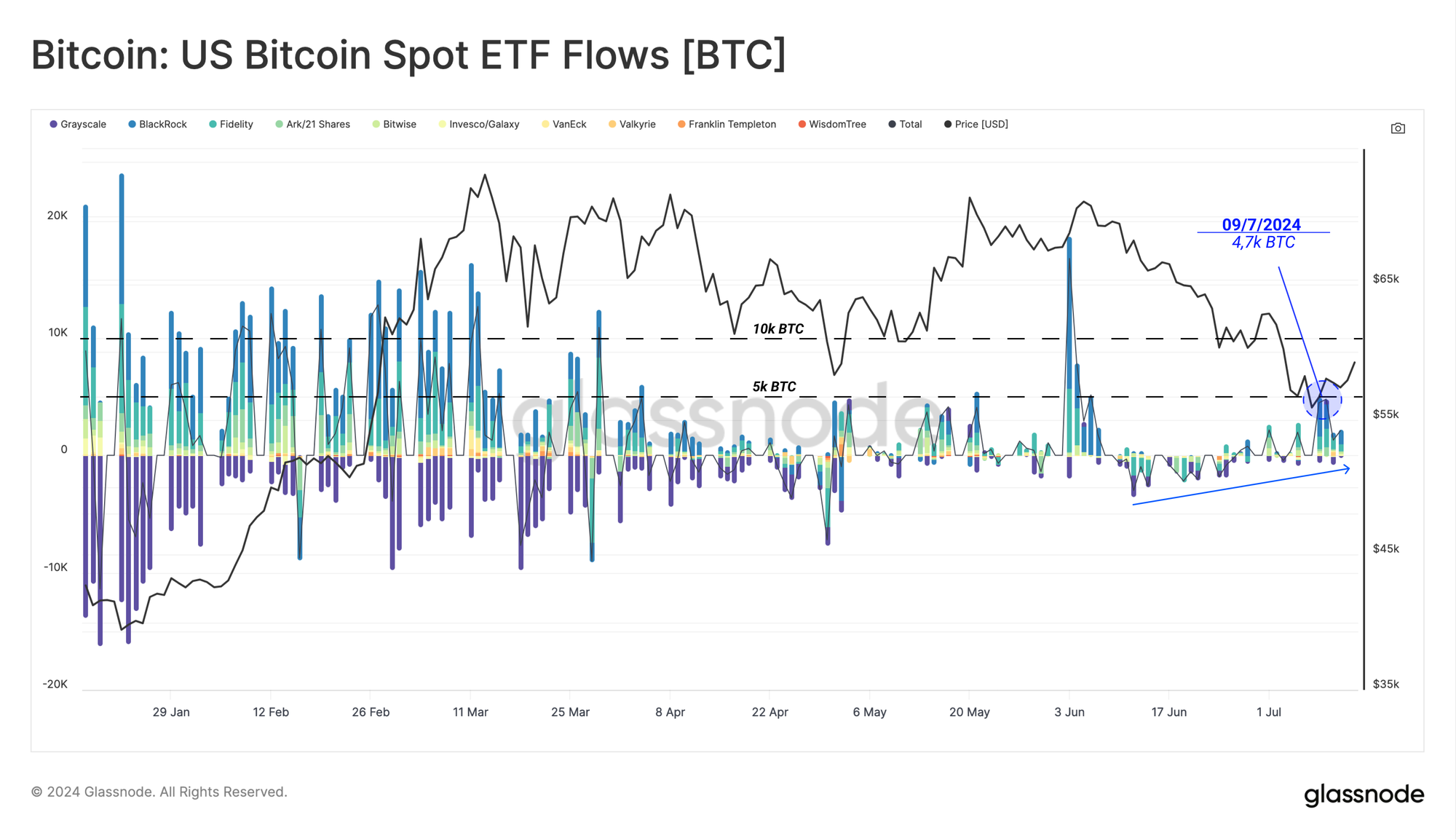 Thị trường đã hấp thụ một lượng BTC đáng kể là 48k trong tháng trước khi Chính phủ Đức phân phối toàn bộ lượng BTC của họ. Sự cạn kiệt hoàn toàn áp lực bên bán đến từ Chính phủ Đức đã mang lại cho thị trường một sự nhẹ nhõm đáng kể, trong khi những tia sáng ban đầu về nguồn cầu mới đã kích thích hành động giá tích cực.
