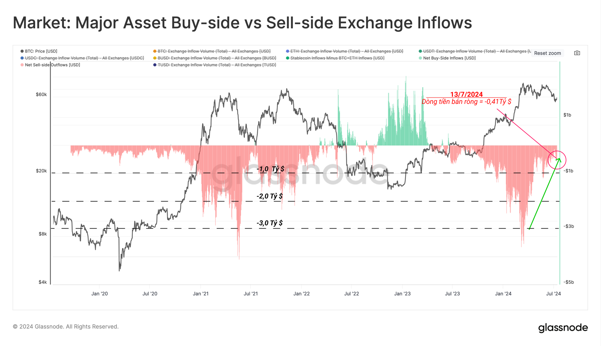 - 🔴 Các giá trị âm gợi ý trạng thái bán ròng, trong đó khối lượng bên bán vượt quá lượng stablecoin mới đang có sẵn để hấp thụ nó.