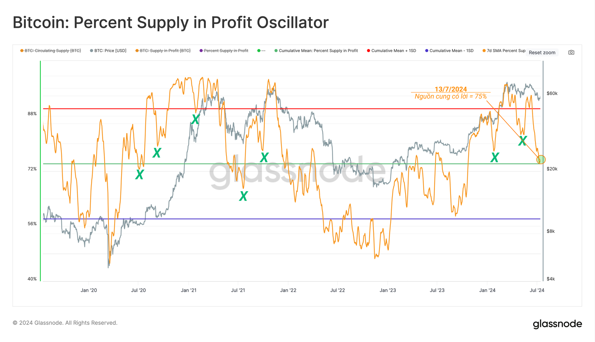 Khi Bitcoin giao dịch xuống mức đáy cục bộ là 53,5k USD, tỷ lệ nguồn cung BTC ở trạng thái thua lỗ chưa thực hiện đã tăng vọt lên khoảng 25% nguồn cung. Điều này khiến chỉ số Phần trăm nguồn cung có lời giảm xuống mức trung bình dài hạn là 75%, đây là mức mà nó đã đạt được trong những đợt điều chỉnh của thị trường tăng giá trước đó.