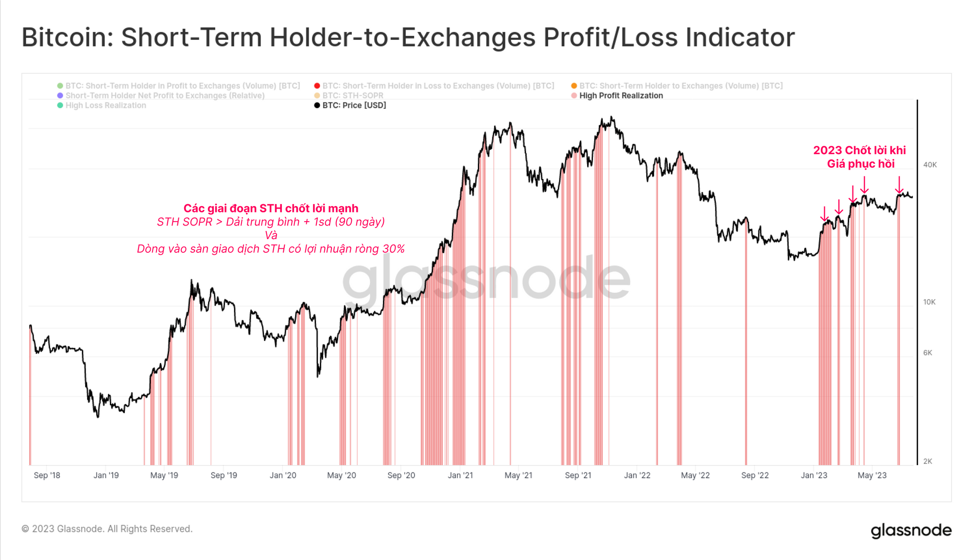 Công cụ này có thể giúp xác định thời điểm nhóm STH đang chốt lời khoản lợi nhuận lớn so với lịch sử gần đây. Đã có một số sự kiện như vậy trong suốt năm 2023, với nhiều sự kiện thiết lập đỉnh thị trường cục bộ.