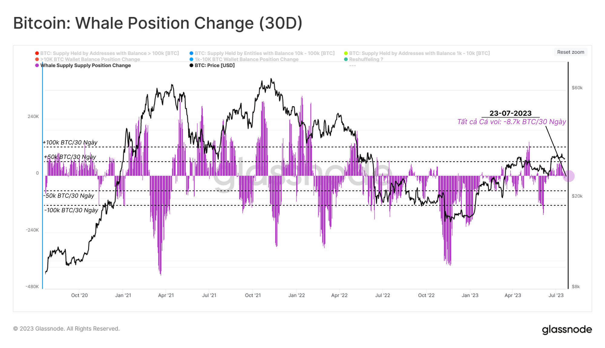 Đây là mức giảm số dư hàng tháng lớn nhất trong lịch sử, đạt -148k BTC/tháng. Điều này chỉ ra rằng có những thay đổi lớn đang xảy ra trong nhóm Cá voi Bitcoin đáng để chúng tôi tìm hiểu sâu hơn.