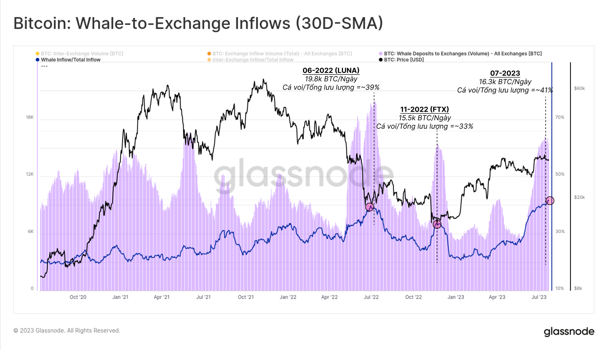 Trong đợt phục hồi gần đây, khối lượng dòng vào liên quan đến cá voi đi vào các sàn giao dịch đã tăng khá đáng kể, đạt +16.3k BTC/ngày. Mức thống trị của cá voi này chiếm 41% trong tất cả các dòng tiền vào sàn giao dịch, tương đương với sự sụp đổ của LUNA (39%) và FTX (33%).
