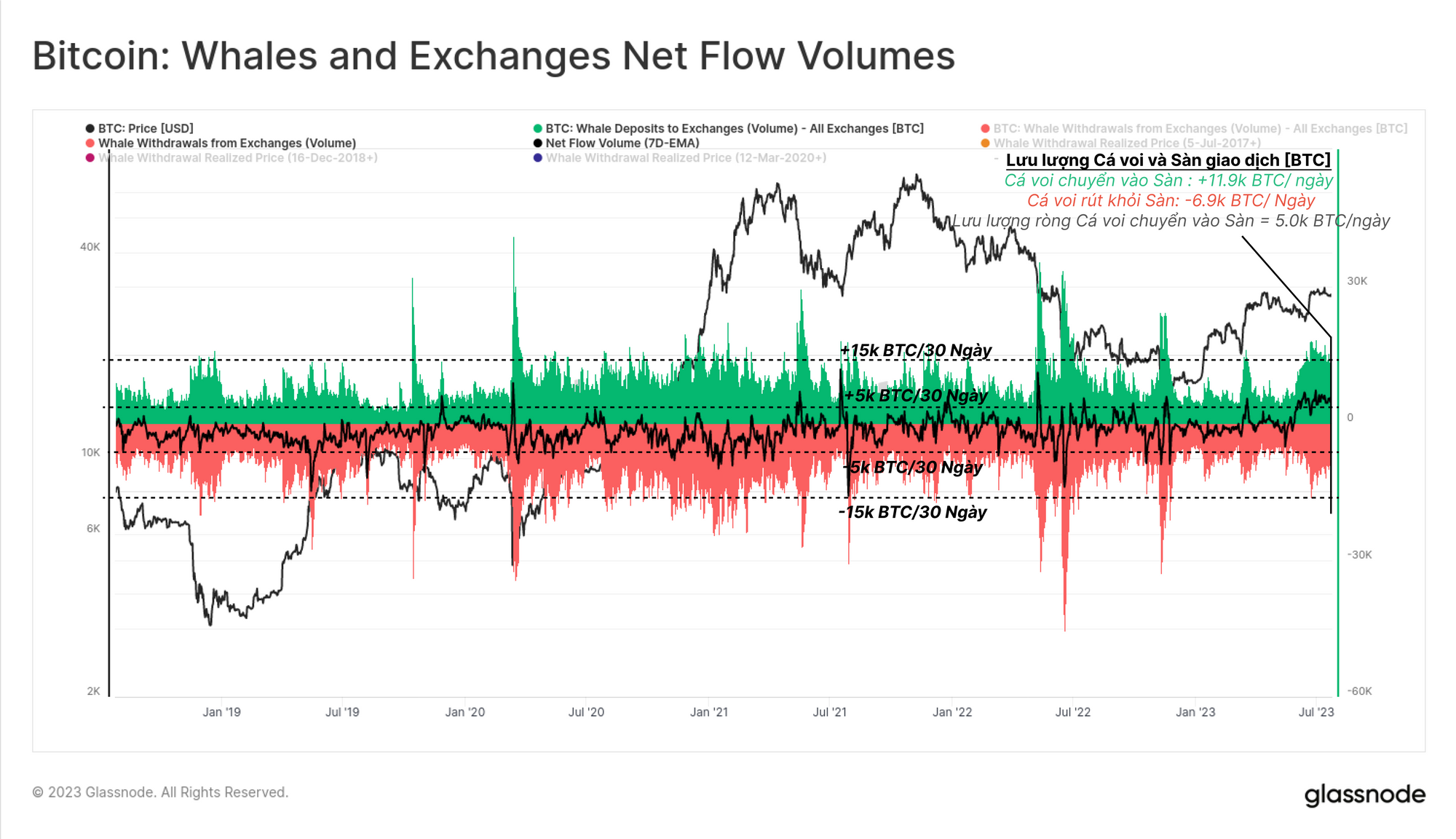 Phân tích Dòng vốn liên quan đến cá voi tới các Sàn giao dịch có thể được sử dụng làm đại diện cho ảnh hưởng của chúng đối với cân bằng cung và cầu. Dòng chảy ròng từ cá voi qua sàn giao dịch có xu hướng dao động trong khoảng ±5k BTC/ngày trong năm năm qua.