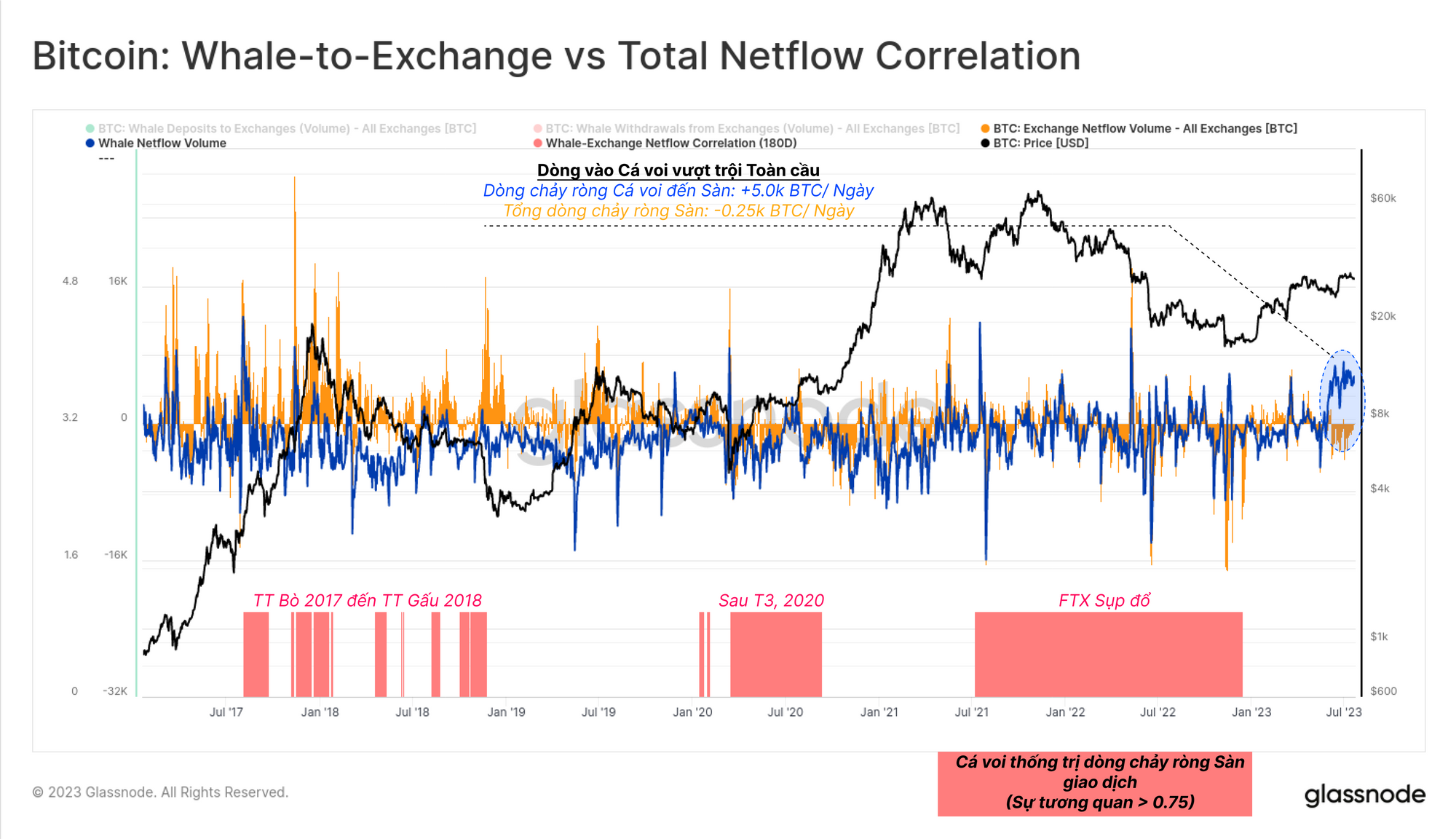 Chúng tôi sẽ quay trở lại một công cụ tương quan đơn giản để xác định các giai đoạn mà cá voi thống trị dòng chảy sàn giao dịch toàn cầu. Biểu đồ bên dưới cho thấy các giai đoạn có mối tương quan cao (0.75 trở lên) giữa dòng chảy ròng của Cá voi và dòng chảy ròng của sàn giao dịch toàn cầu 🟥 (gợi ý về sự thống trị của cá voi), với ba giai đoạn chính sau: