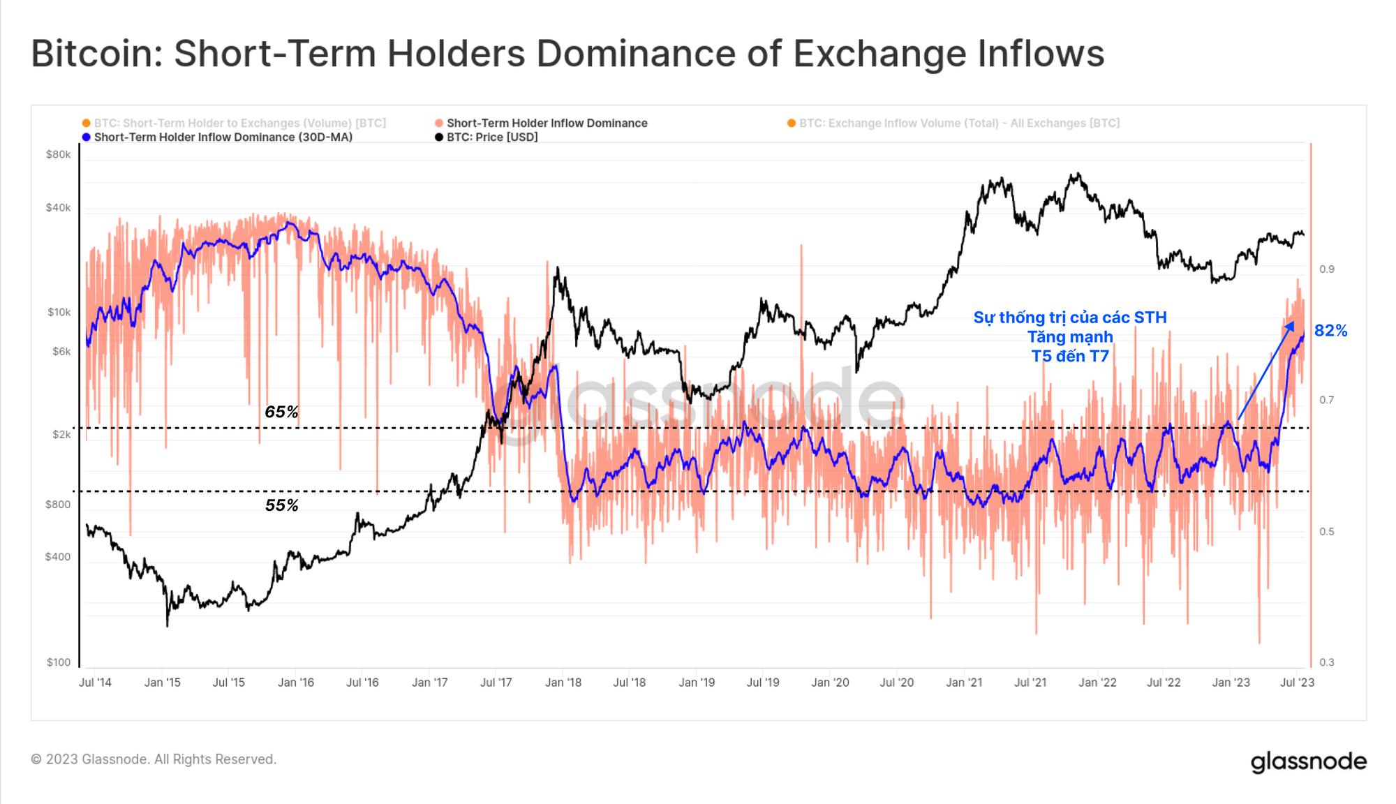 Sự thống trị của Người nắm giữ ngắn hạn đối với dòng tiền vào sàn giao dịch đã bùng nổ lên 82%, hiện cao hơn đáng kể so với phạm vi dài hạn trong năm năm qua (thường là 55%-65%). Từ đó, chúng ta có thể thiết lập một trường hợp rằng phần lớn hoạt động giao dịch gần đây được thúc đẩy bởi các Cá voi hoạt động trong thị trường năm 2023 (và do đó được phân loại là những người nắm giữ ngắn hạn).