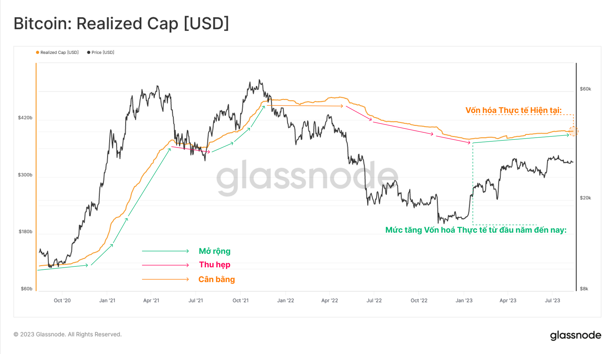 Chúng tôi có thể phân tách Vốn hoá Thực tế thành các thành phần Người nắm giữ dài hạn (LTH) và ngắn hạn (STH). Tài sản do nhóm STH nắm giữ đã tăng 22 tỷ đô la trong năm nay, trong khi nhóm LTH chứng kiến mức giảm tương đương 21 tỷ đô la.