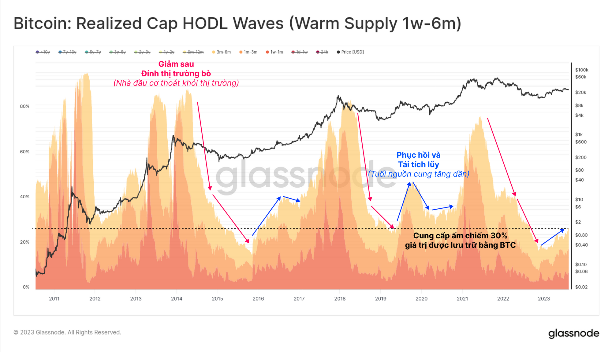 Chuyển sang nhóm Nguồn cung ấm (1 tuần-6 tháng), chúng ta có thể thấy mức tăng nhẹ so với đầu năm, chiếm khoảng 30% tài sản được lưu trữ trong Bitcoin.