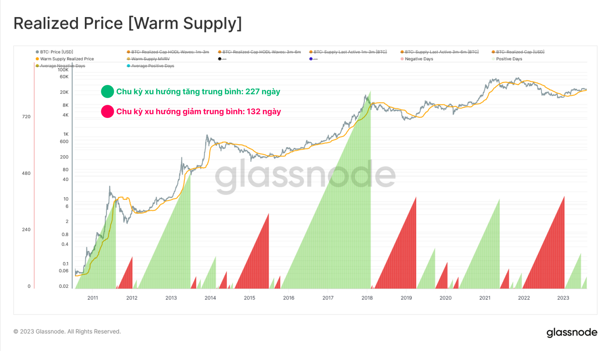 Trong lịch sử các đợt phá vỡ kéo dài trên hoặc dưới cơ sở chi phí Nguồn cung ấm phù hợp với sự thay đổi vĩ mô trong xu hướng thị trường, với xu hướng tăng trung bình kéo dài 227 ngày và xu hướng giảm trung bình kéo dài 132 ngày.