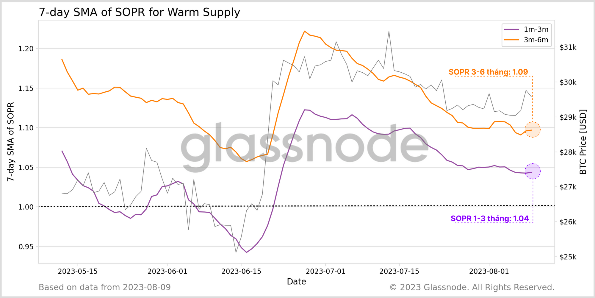 Sức mạnh thị trường năm 2023 đã được vốn hóa thành công,với việc chốt lời có thể nhìn thấy trên tất cả các thành phần SOPR trong nhóm Nguồn cung ấm. Đồng coin chi tiêu trung bình có khoảng 4% đến 9% lợi nhuận trong vài tháng qua.