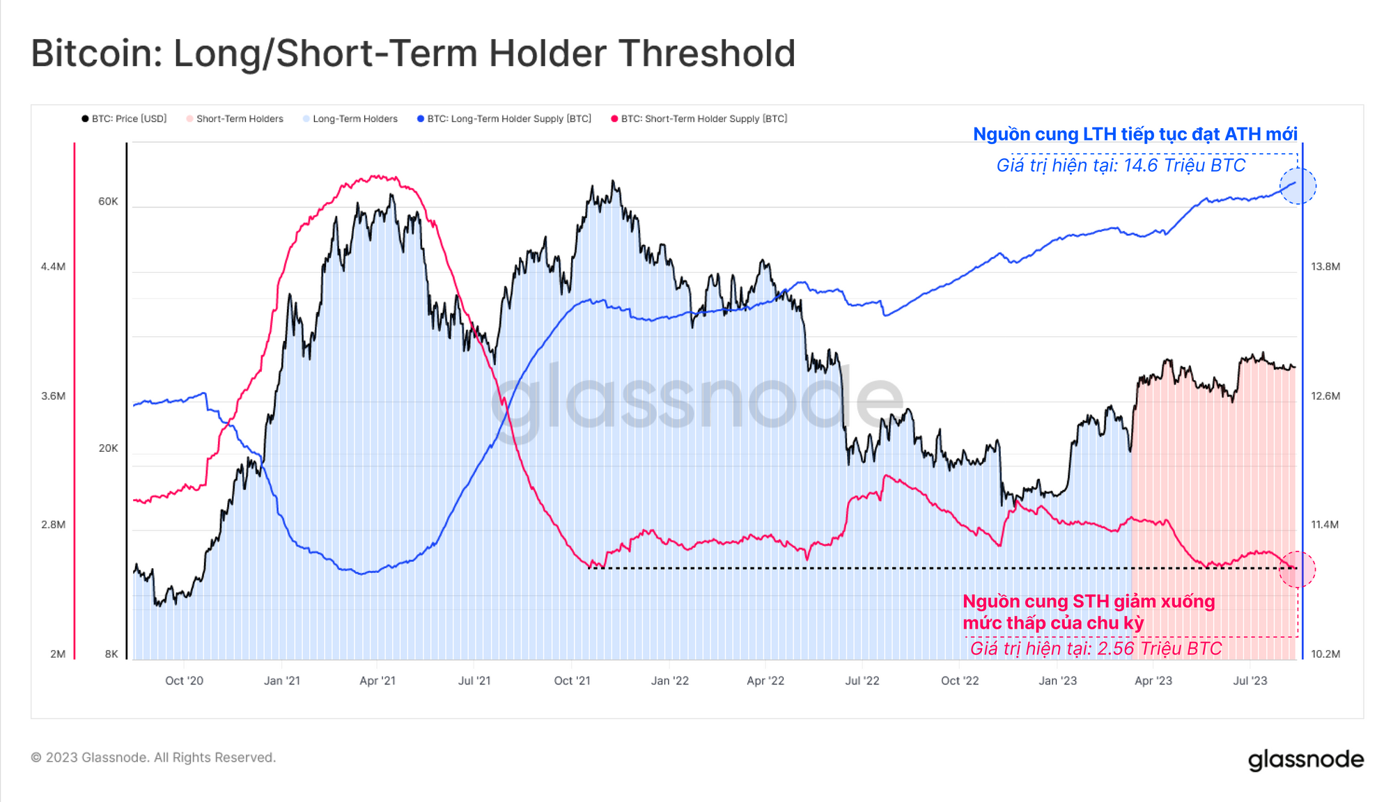 Chúng tôi lưu ý rằng nguồn cung do LTH nắm giữ tiếp tục tăng, đạt mức ATH là 14.6 triệu BTC. Ngược lại, nguồn cung của STH đã giảm xuống mức thấp nhất trong nhiều năm là 2.56 triệu BTC.