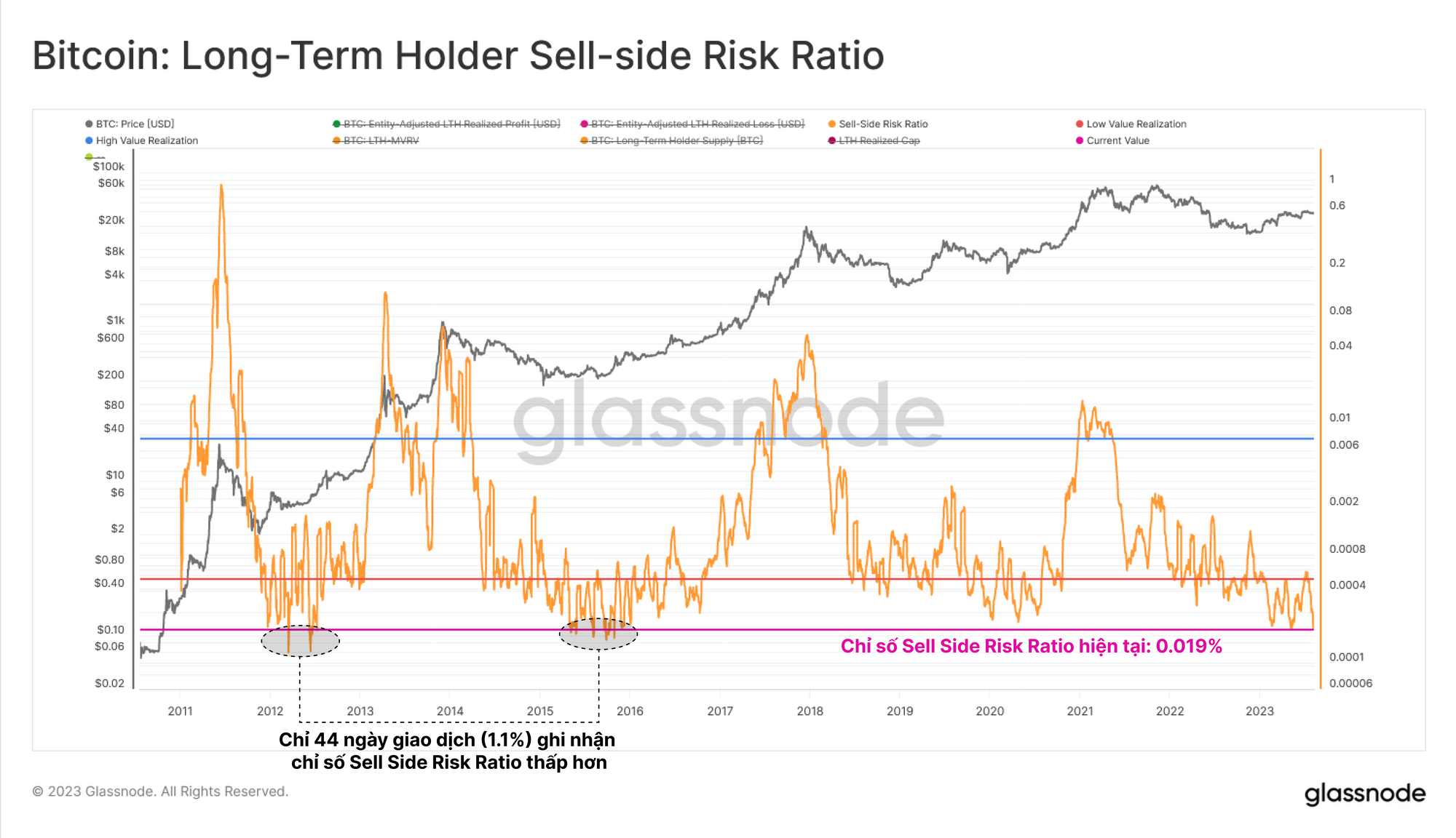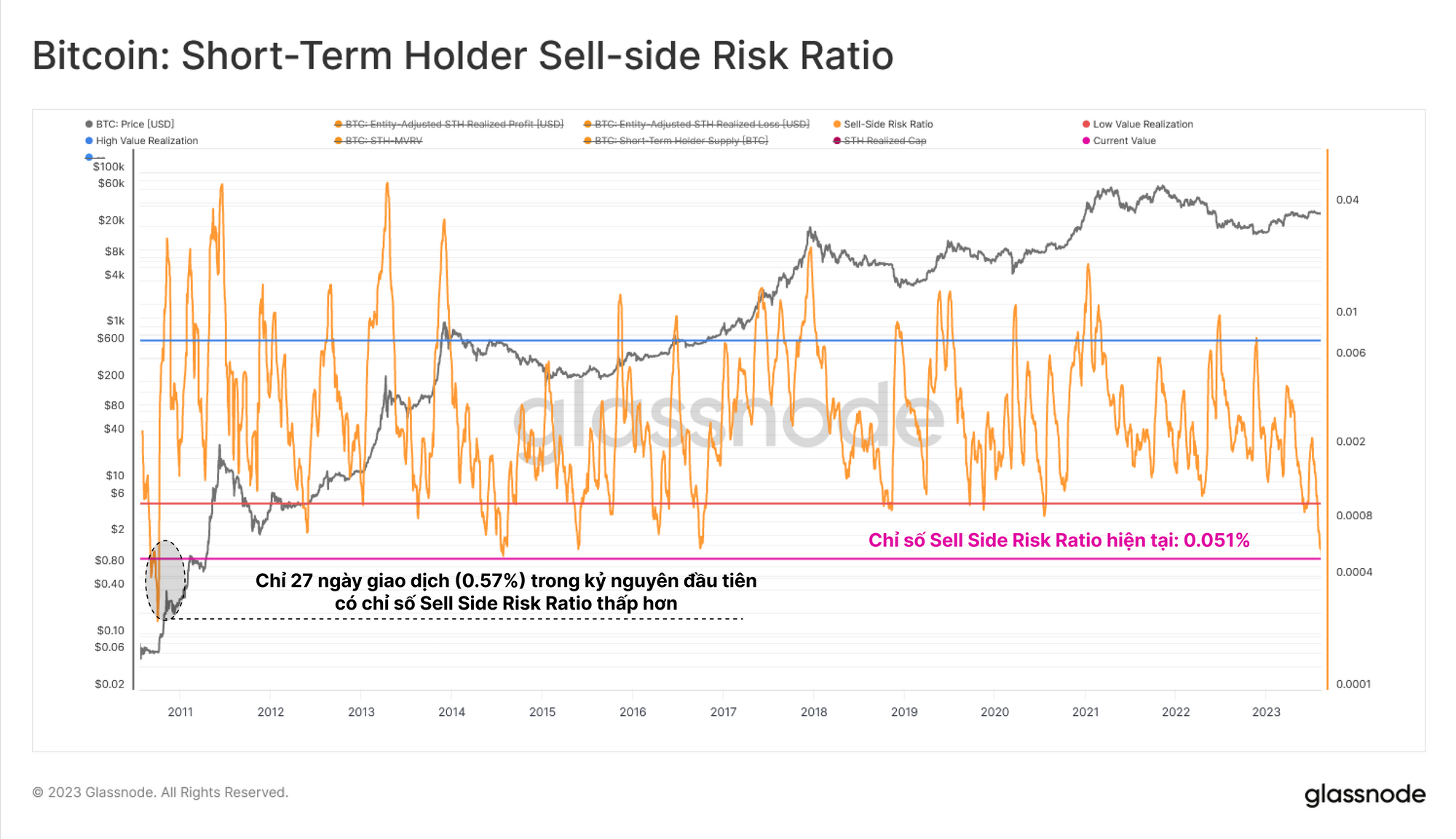 Một công cụ lý tưởng để theo dõi điều này là Sell-Side Risk Ratio, chỉ báo này so sánh giá trị tuyệt đối của lãi lỗ thực tế (sự thay đổi trong định giá tài sản) với vốn hoá thực tế (định giá tài sản). Đối với STH, chúng ta có thể thấy chỉ số này thực sự ở mức thấp nhất mọi thời đại, với ít hơn 27 ngày giao dịch (0.57%) cho thấy giá trị thấp hơn.