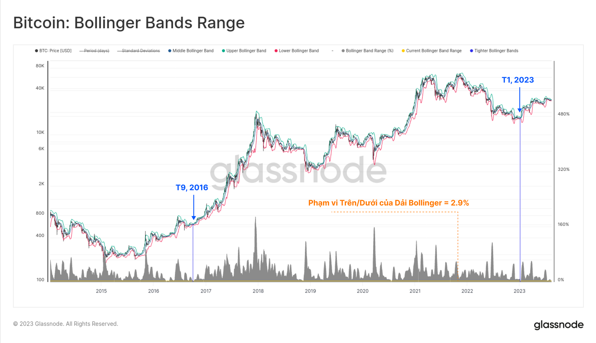 Như chúng tôi đã đề cập trong phiên bản tuần trước (WoC 32), biến động giá của BTC đã giảm xuống mức đáy trong lịch sử. Dải Bollinger trên và dưới hiện chỉ cách nhau 2.9%, chỉ 2 lần trong lịch sử có mức chênh lệch thấp hơn: