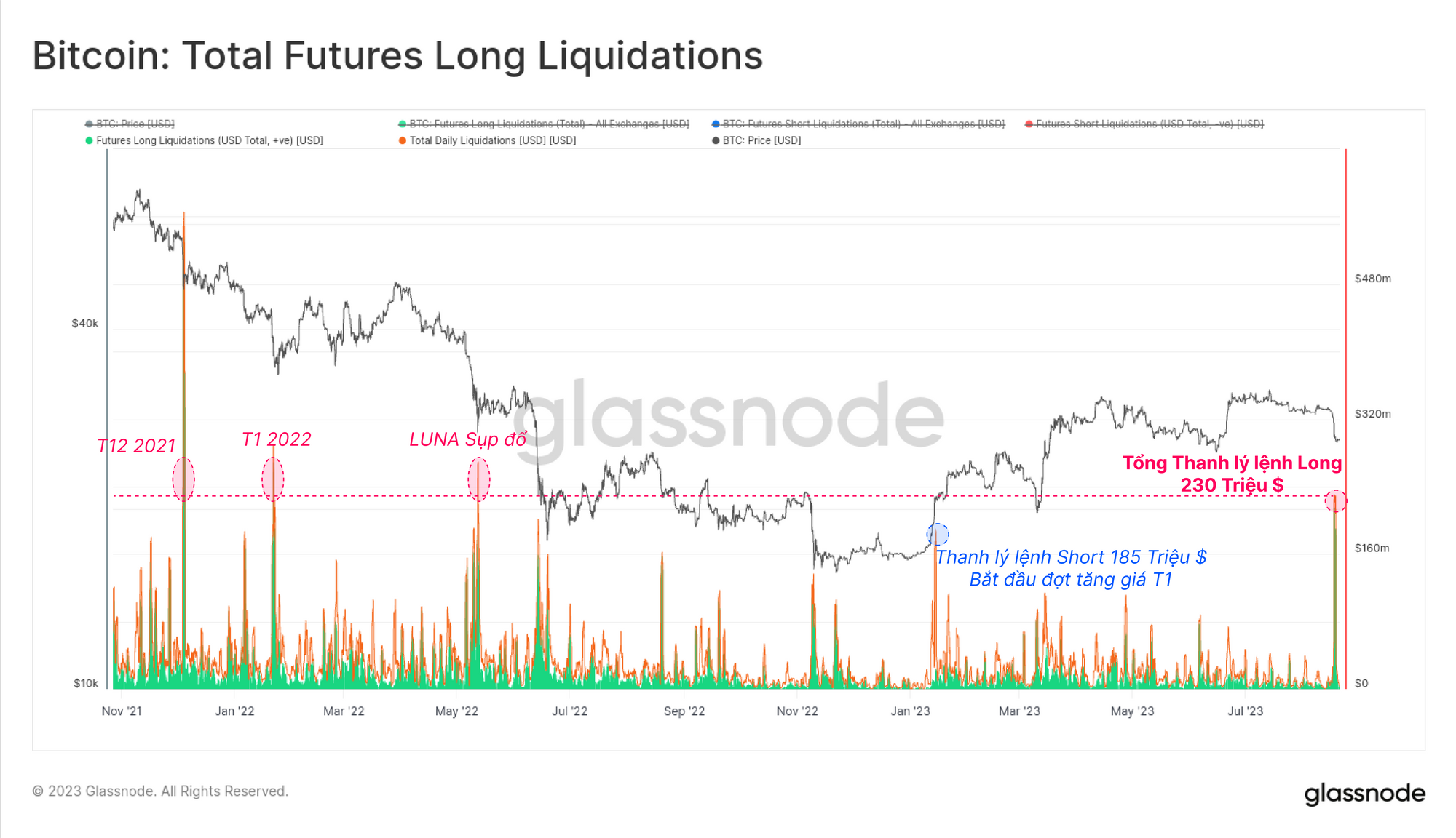 Tổng cộng 230 triệu USD ở các vị thế mua đã bị thanh lý và buộc phải đóng lại trong vài giờ, tạo nên sự kiện thanh lý lớn nhất kể từ khi LUNA sụp đổ vào tháng 5 năm 2022. Sự kiện thanh lý này có quy mô lớn hơn so với đợt thanh lý lệnh bán vào tháng 1, là điểm khởi đầu cho đợt tăng giá năm 2023, cho thấy nó có thể có tiềm năng thay đổi xu hướng.