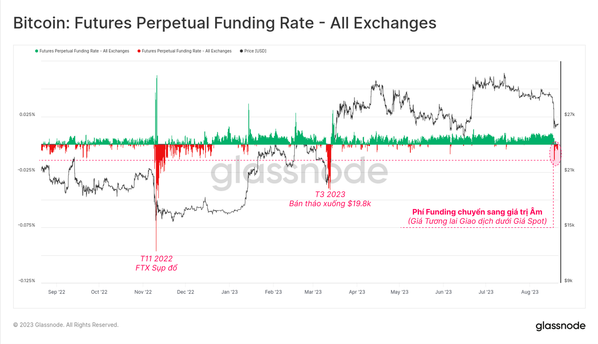 Đây là mức phí funding âm sâu nhất kể từ đợt bán tháo vào tháng 3 xuống mức $19.8k. Nói chung, điều này cho thấy rằng việc tích luỹ đòn bẩy và sự thanh lý sau đó trong các thị trường tương lai là yếu tố chính thúc đẩy đợt bán tháo này.