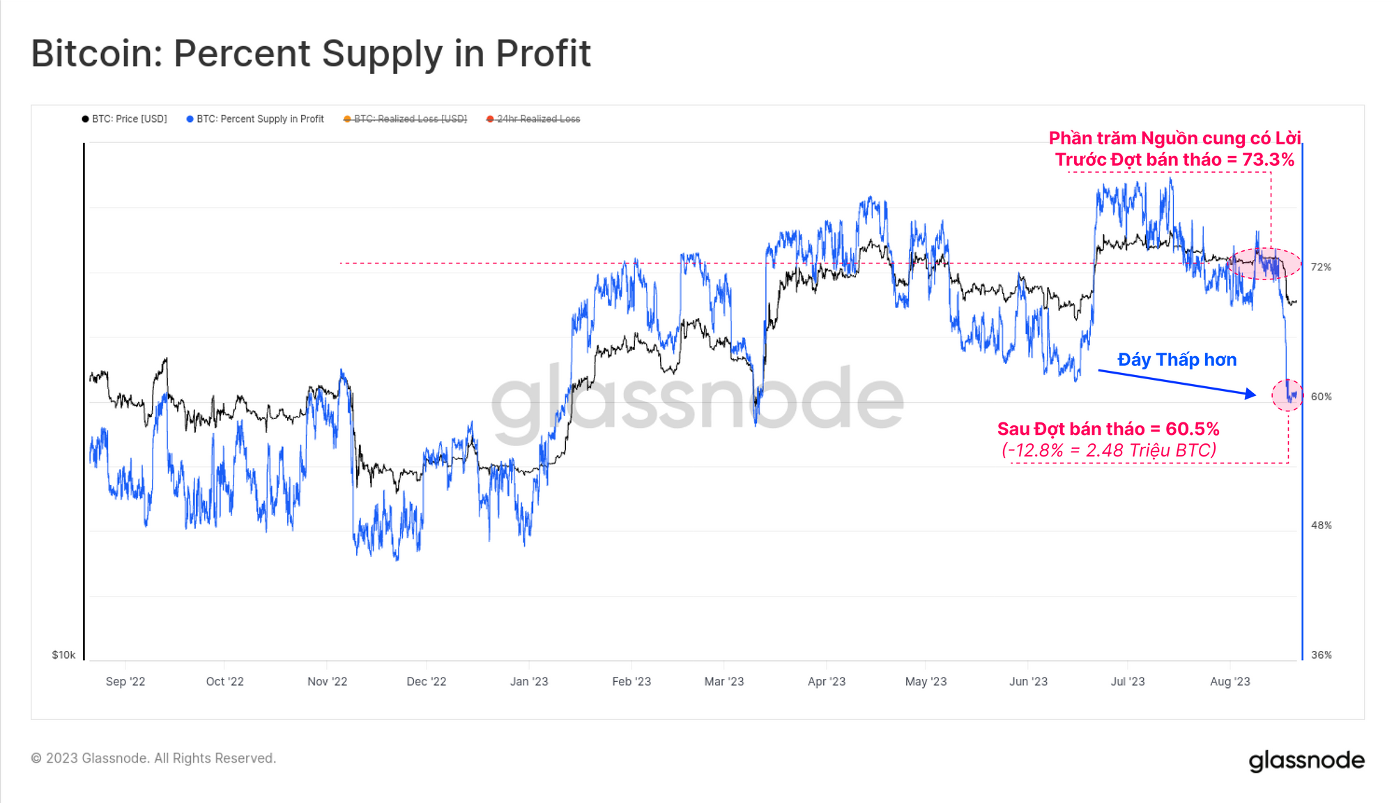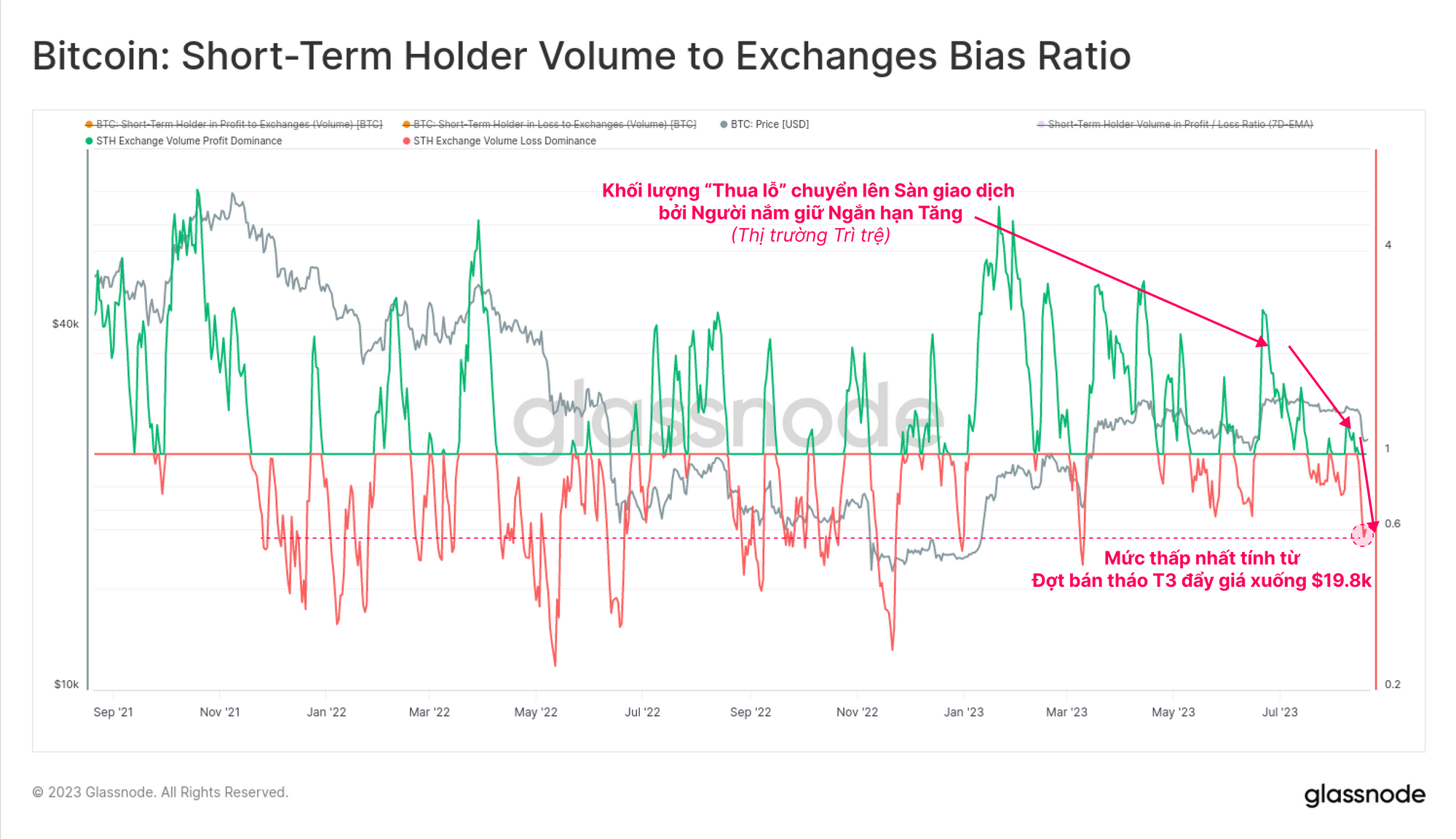 Biến thể của số liệu này được hiển thị bên dưới dành riêng cho những Người nắm giữ Ngắn hạn, là nhóm phản ứng mạnh nhất trước sự biến động của thị trường. Có thể thấy rằng sau vài tháng lợi nhuận thống trị giảm dần, động lượng thua lỗ và thua lỗ thống trị đã tăng lên đáng kể. Các tín hiệu sai vẫn xảy ra, chẳng hạn như trong đợt điều chỉnh vào tháng 3 năm 2023 và một vài sự kiện trong lịch sử đã phục hồi nhanh chóng.