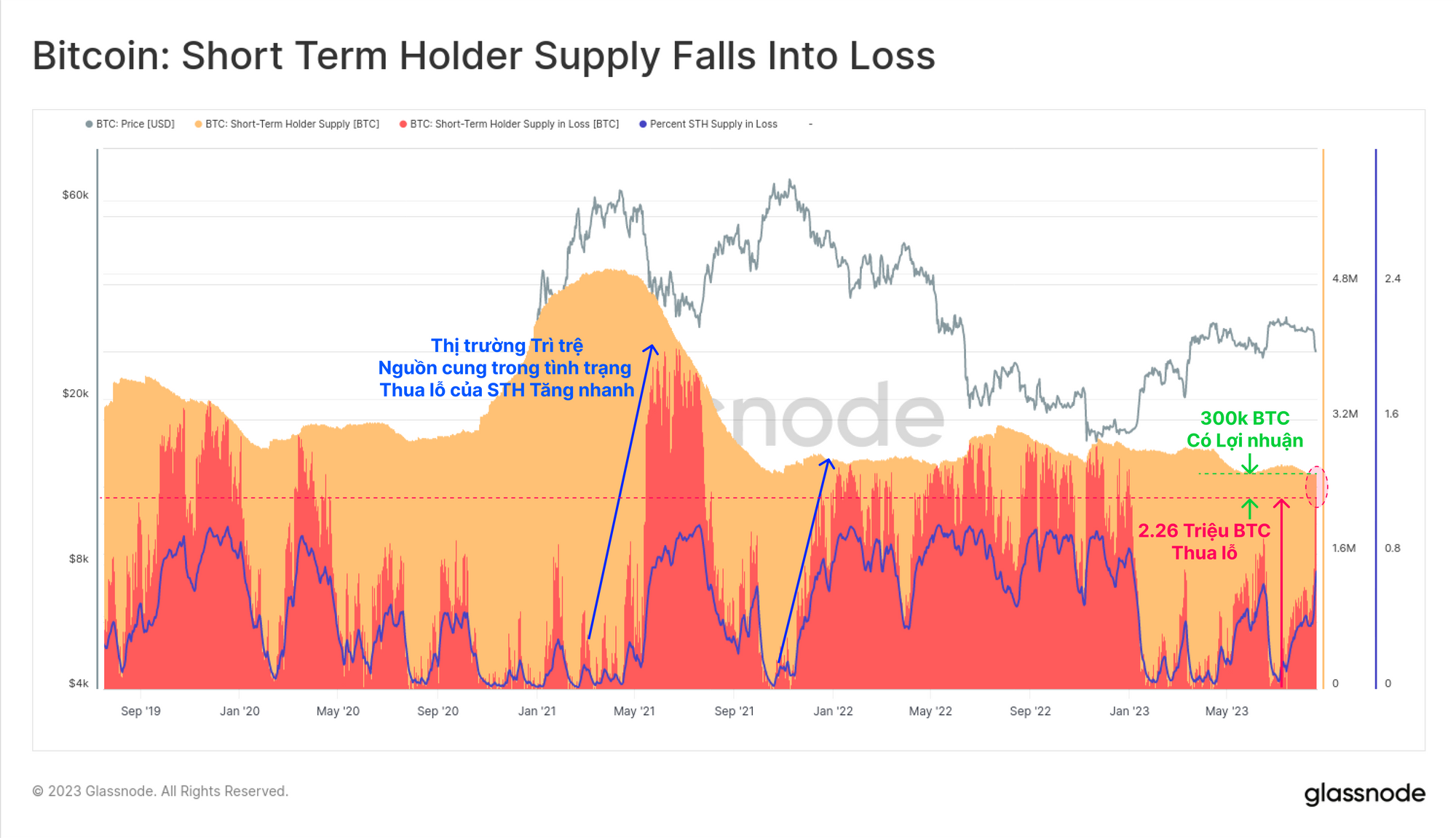 Với nguồn cung LTH ở mức ATH, chúng ta cũng có thể thấy rằng nguồn cung STH vẫn ở mức thấp nhất trong nhiều năm. Tuy nhiên, biểu đồ bên dưới thể hiện tỷ lệ nguồn cung STH được giữ ở mức lỗ chưa thực hiện.