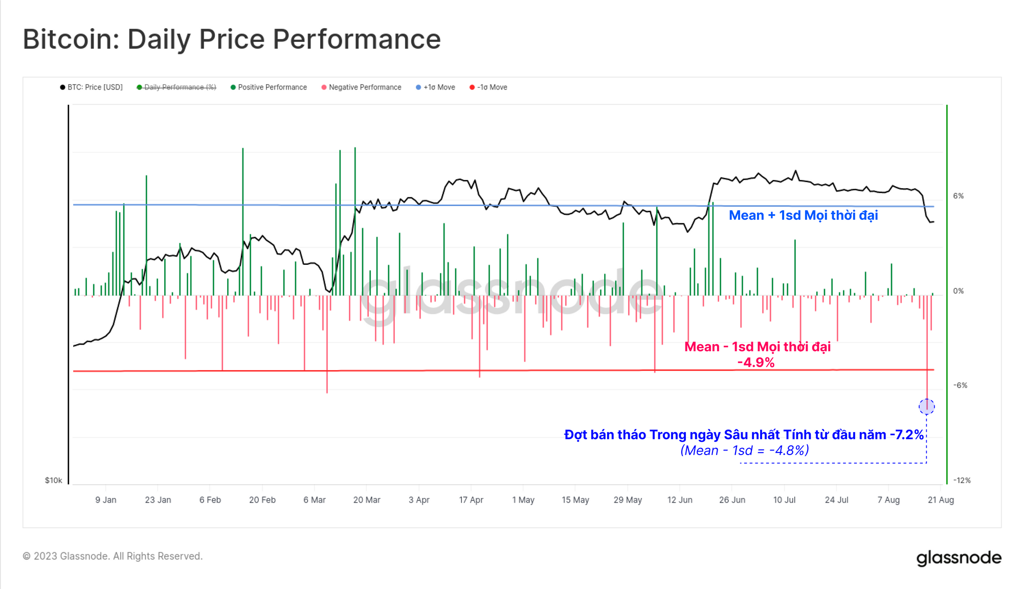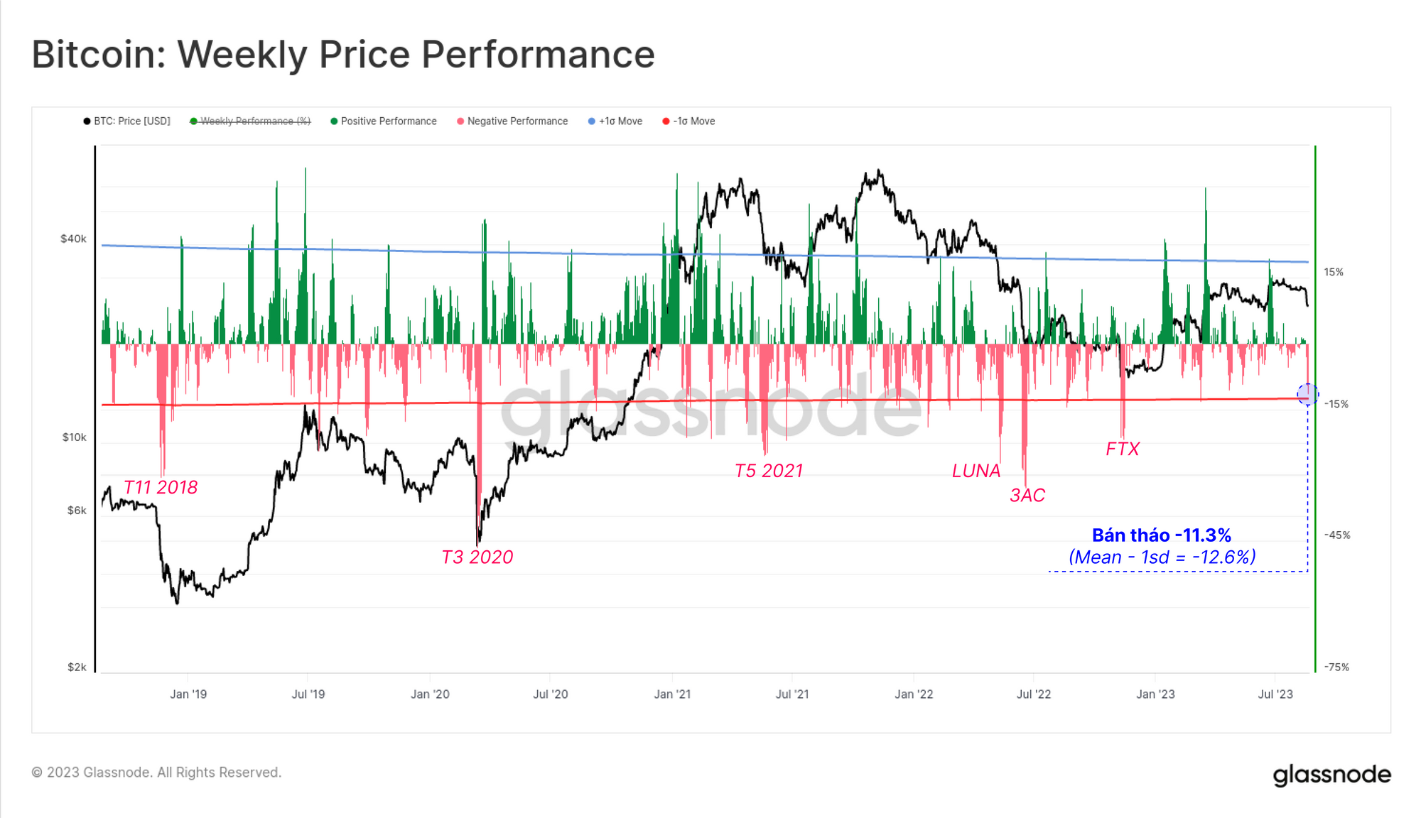 Hành động giá hàng tuần đã giao dịch giảm -11.3%, đây là mức giảm đáng kể nhưng không phải là mức lớn nhất trong những năm gần đây. Hiệu suất này tương ứng -12.6 % gần chạm đườnglệch chuẩn tiêu chuẩn 1dài hạn, là mức đã bị chọc thủng trong các sự kiện đầu hàng lớn như sự kiện sụp đổ của FTX, 3AC và LUNA.