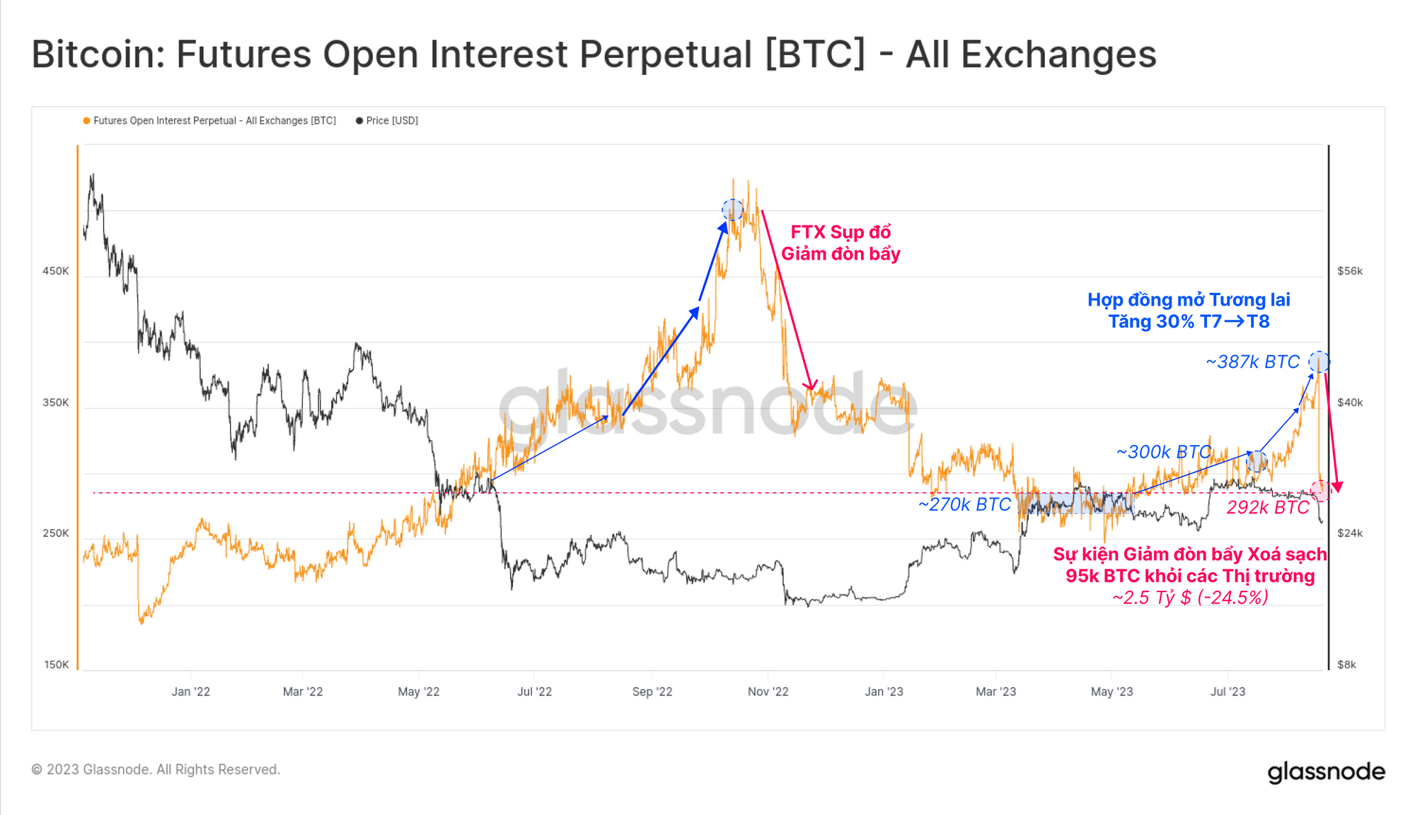 Không giống như các thị trường quyền chọn, các nhà giao dịch hợp đồng tương lai đã trải qua một sự kiện giảm đòn bẩy lớn có những điểm tương đồng đáng chú ý với sự sụp đổ của FTX. Mặc dù có quy mô nhỏ hơn nhưng các hợp đồng tương lai vĩnh cửu trị giá hơn 2.5 tỷ USD đã được đóng chỉ trong một ngày. Điều này đại diện cho mức giảm -24.5% và loại bỏ hoàn toàn tất cả đòn bẩy tích lũy từ tháng 7 đến tháng 8.