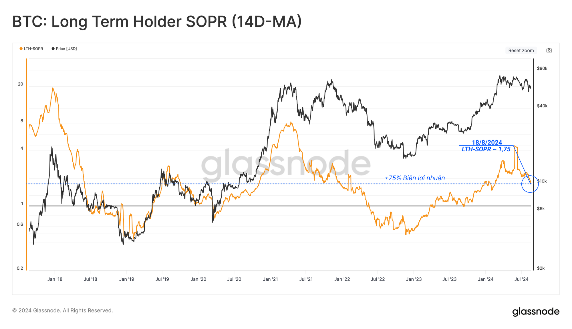 Theo số liệu SOPR Người nắm giữ dài hạn, có thể thấy rằng các BTC này đang chốt lời ở mức lợi nhuận trung bình là +75% và LTH-SOPR vẫn ở mức cao tại thời điểm này.