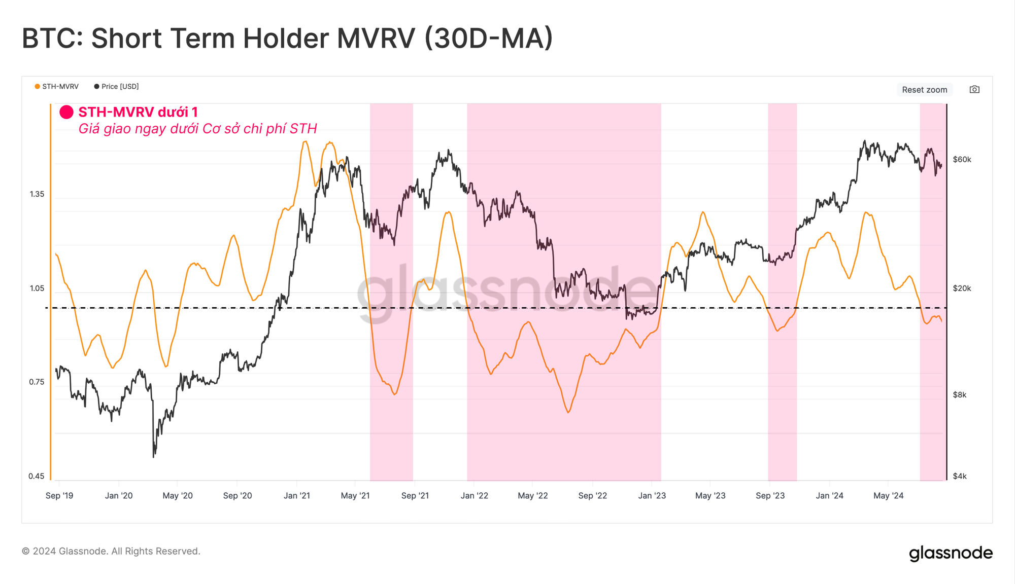 STH-MVRV gần đây đã giảm xuống dưới giá trị cân bằng là 1,0, cho thấy rằng các nhà đầu tư mới trung bình hiện đang nắm giữ các khoản lỗ chưa thực hiện.