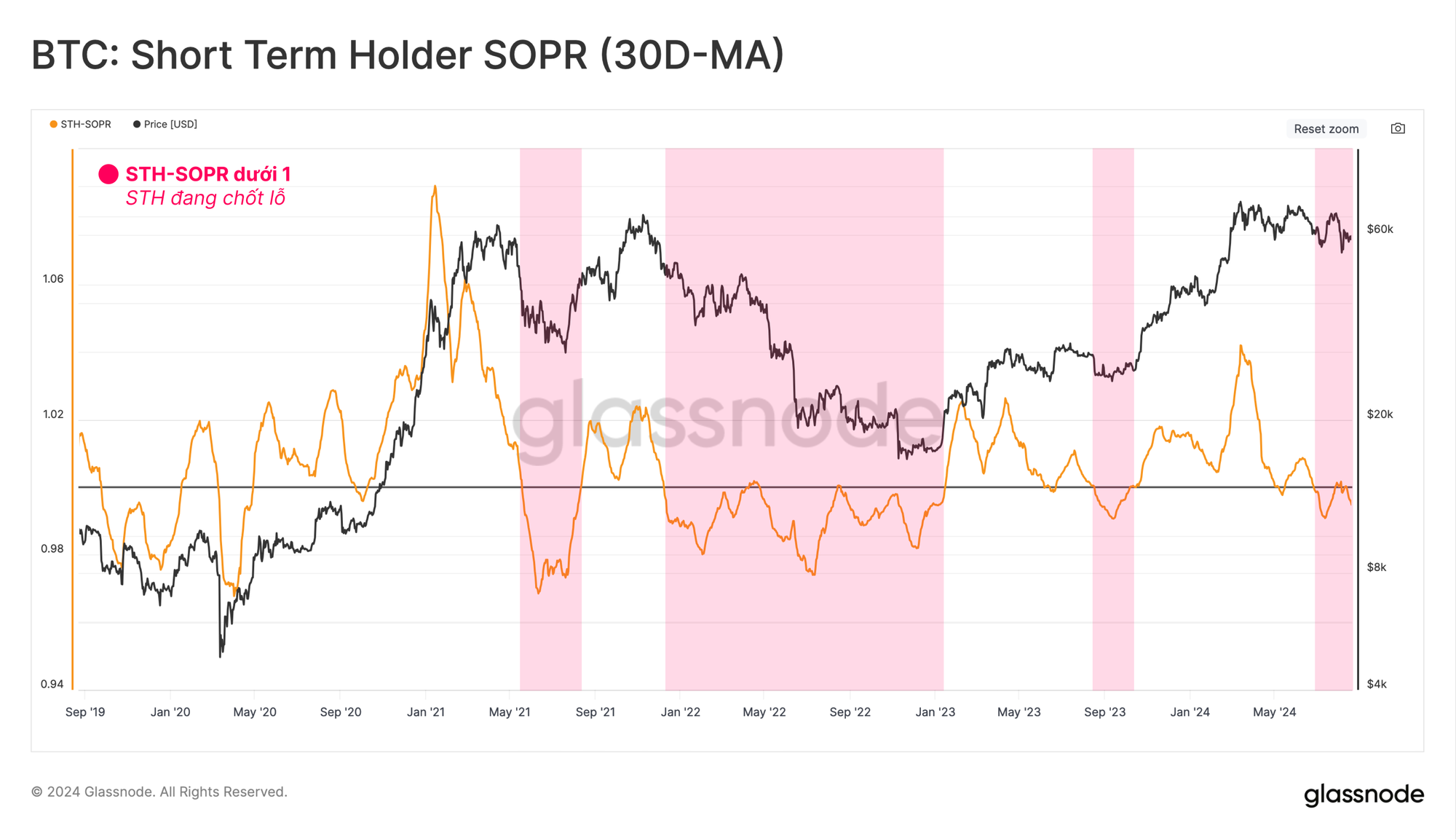 Các giai đoạn mà các nhà đầu tư mới hiện thực hoá thua lỗ ở mức cao có thể được thấy khi STH-SOPR giao dịch dưới 1,0.