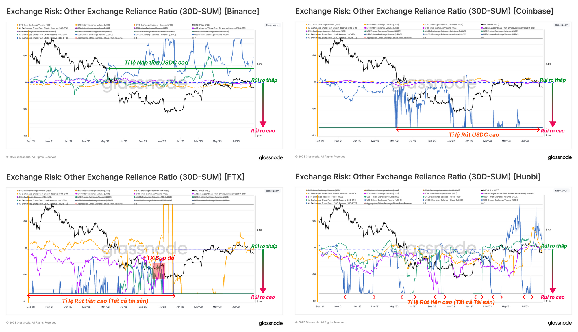 - Binance (phía trên bên trái): Tất cả tài sản đều có tỷ lệ phụ thuộc trung lập và gần bằng 0, cho thấy dòng vốn chảy từ hoặc đến các sàn giao dịch khác là nhỏ so với số dư trên Binance. Tỷ lệ phụ thuộc của USDC cho thấy tỉ lệ nạp tiền cao kể từ tháng 9 năm 2022, điều này có thể được giải thích bằng cách xem xét USDC trên Coinbase.