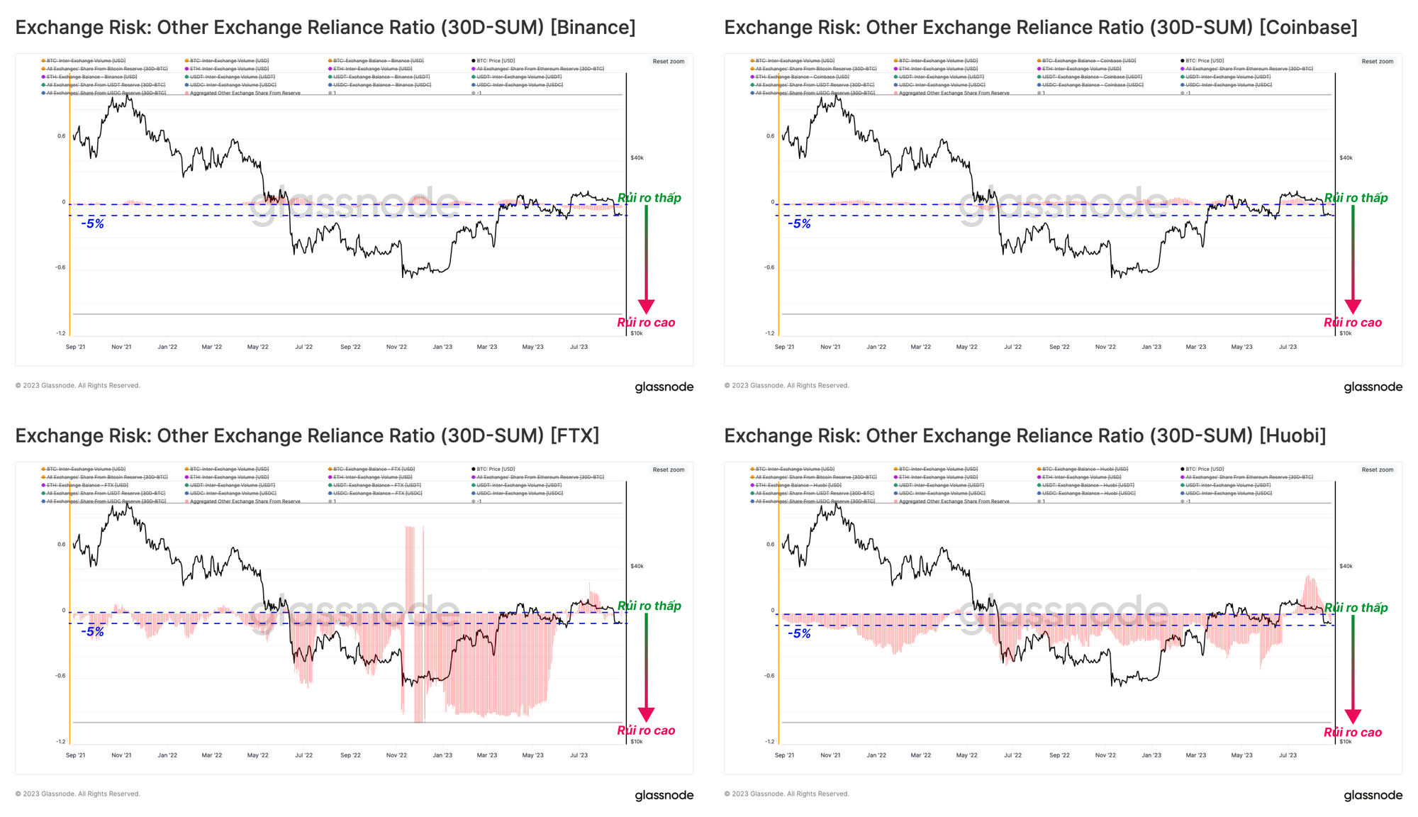 - Tỷ lệ Phụ thuộc Sàn giao dịch - mức độ mà số dư sàn giao dịch di chuyển đến/từ các sàn giao dịch khác (chuyển khoản giữa các sàn giao dịch).
