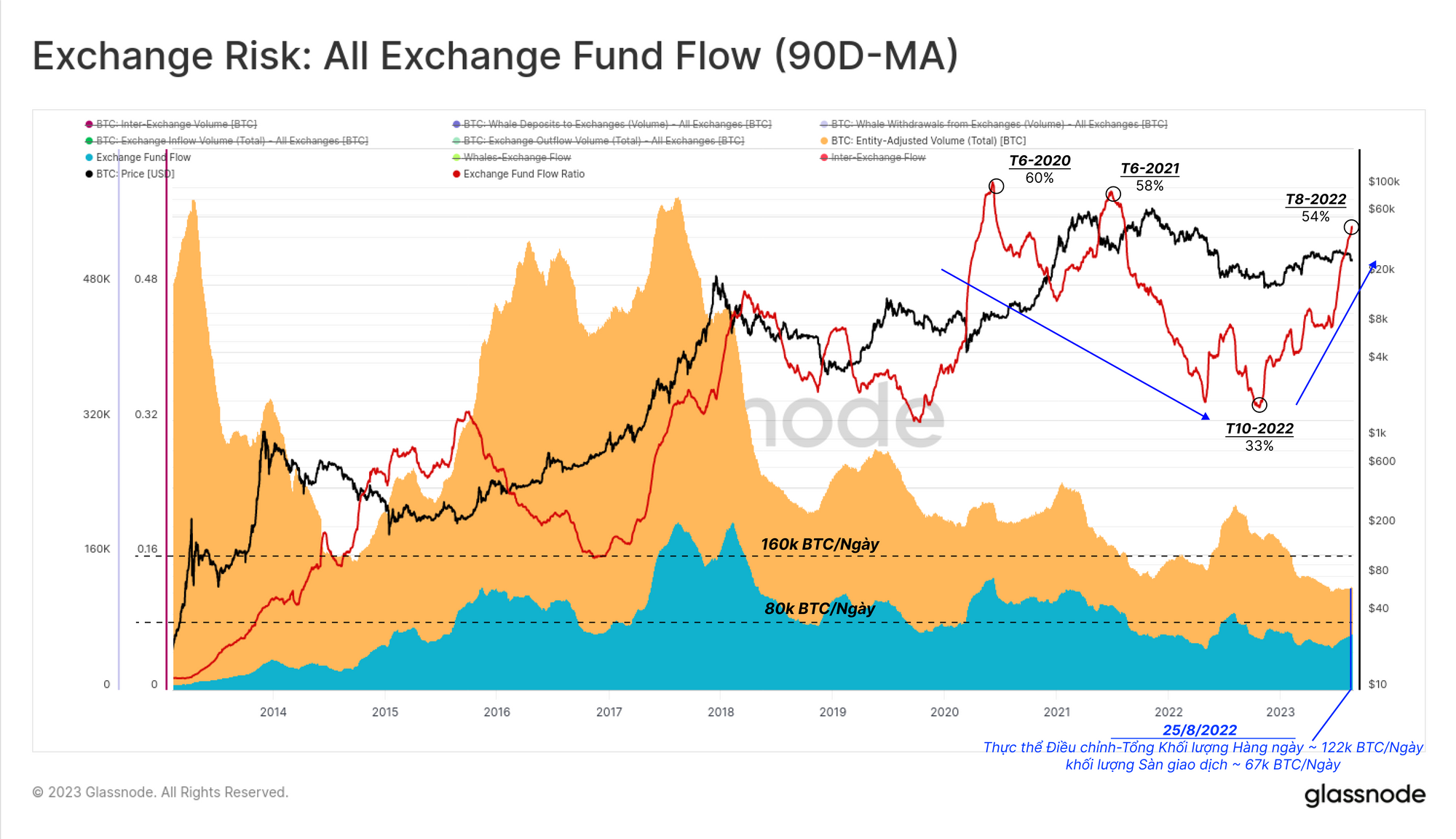Trong khối lượng 122k BTC này, tiền gửi hoặc rút trên sàn giao dịch chiếm hơn 54% (67.3k BTC/ngày, tỉ lệ gửi/rút thường là 50/50). Như vậy, các quan sát về dòng chảy kinh tế vào và ra khỏi các sàn giao dịch có xu hướng khá dày đặc thông tin.