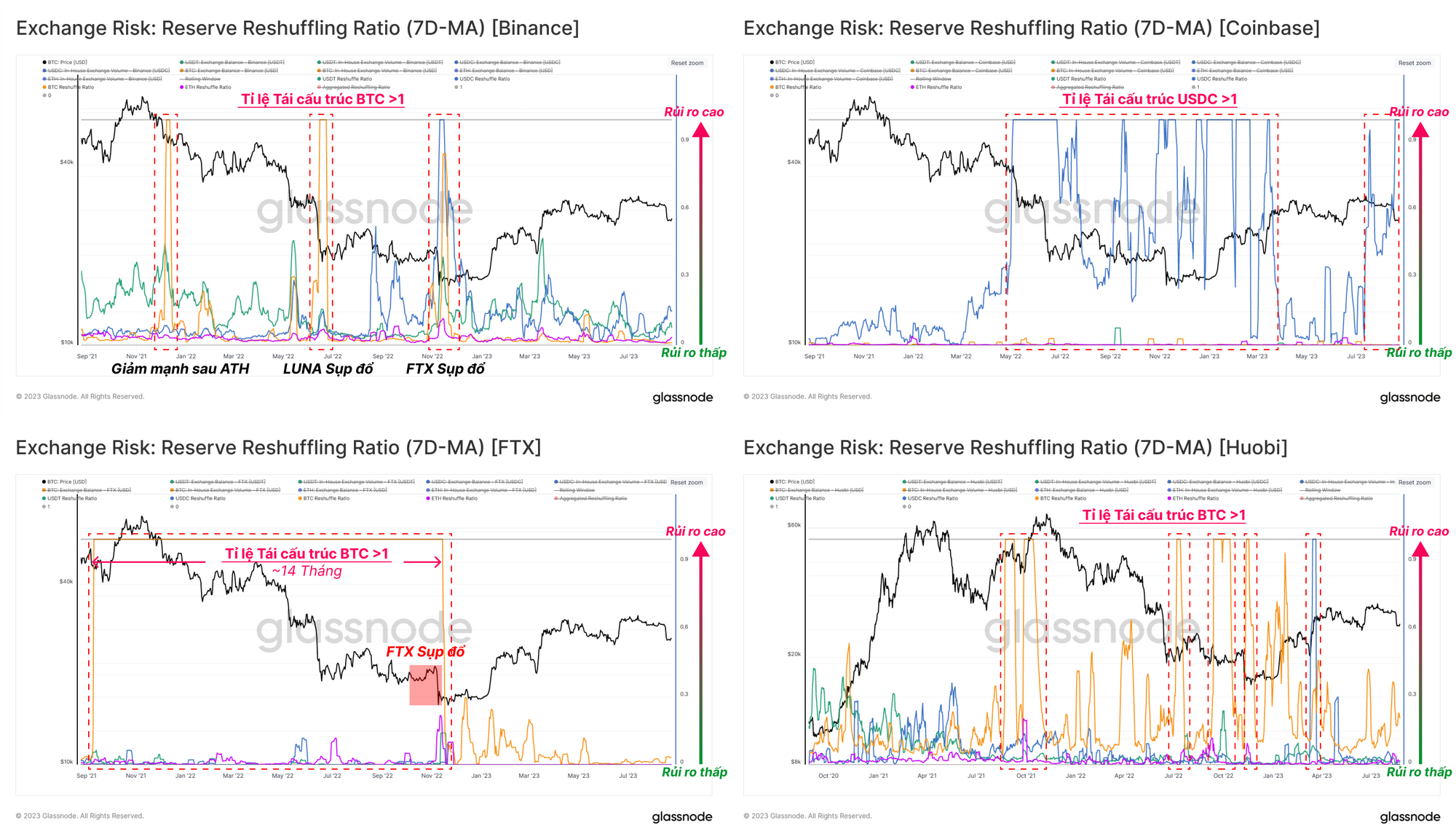 - FTX (phía dưới bên trái): Tỷ lệ tái cấu trúc BTC báo hiệu trạng thái rủi ro cao trong 14 tháng trước khi sàn giao dịch sụp đổ. Nhìn lại thì điều này có thể là kết quả của việc Alameda chiếm đoạt tiền của khách hàng.