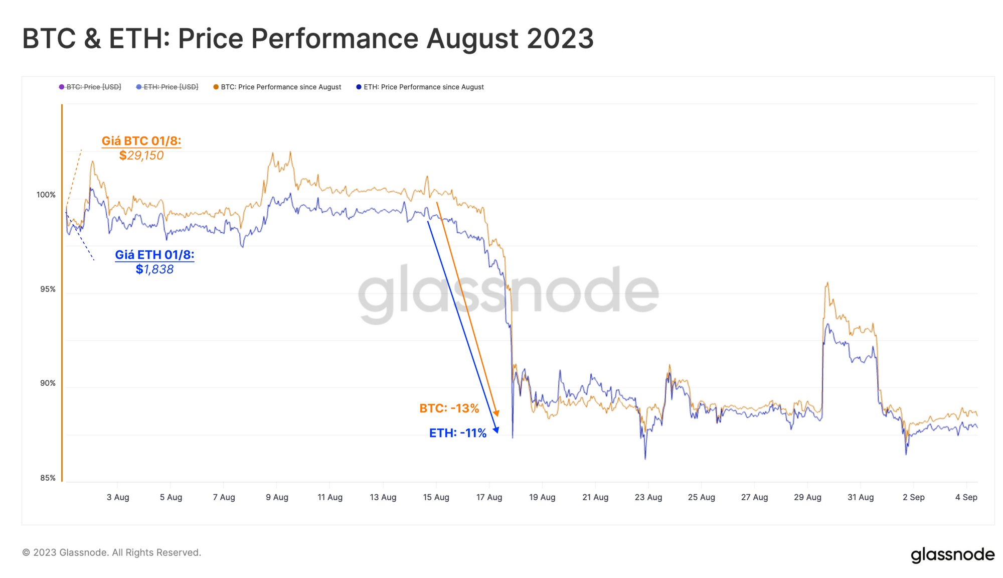 Giá giao ngay của cả BTC và ETH hiện đang suy yếu quanh mức thấp nhất trong tháng 8.