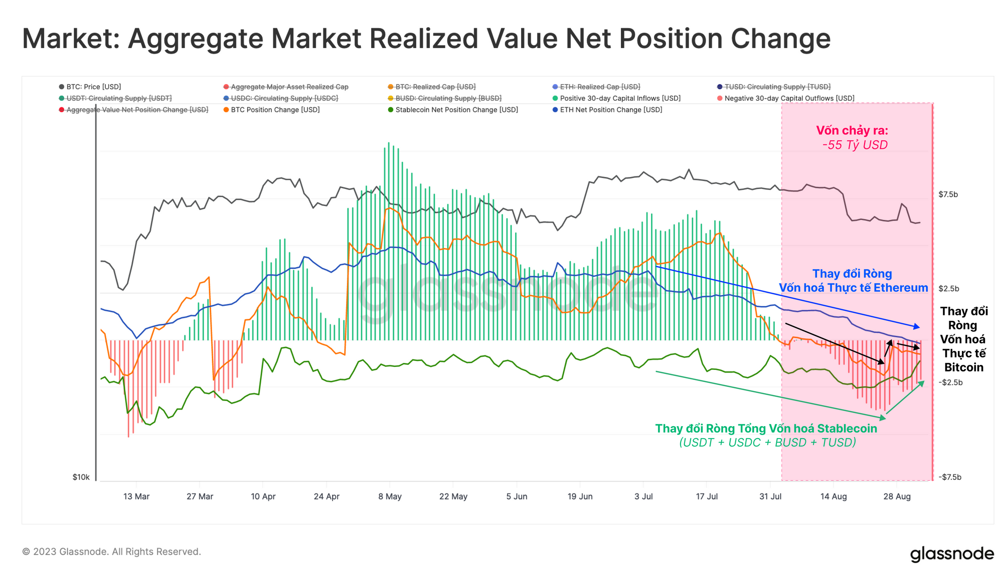 Từ đó, có thể thấy rõ rằng thị trường đã bước vào chế độ dòng vốn chảy ra vào đầu tháng 8, cách khá xa hai sự kiện lớn kể trên. Khoảng 55 tỷ USD đã rời khỏi không gian tài sản kỹ thuật số trong tháng 8.